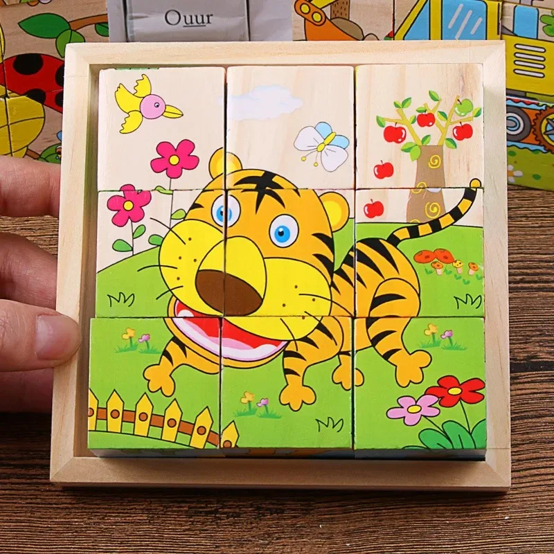 Bloques de madera para bebés, juguetes para niños, rompecabezas de seis cubos laterales, juego de animales, frutas, tráfico, juguete educativo de Aprendizaje Temprano