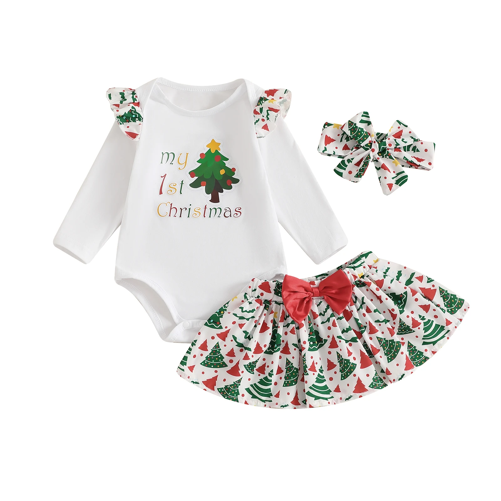 Conjunto de falda de manga larga para niñas, Pelele con estampado de árbol de Navidad, falda acampanada, diadema, de 0 a 24 meses, 3 piezas