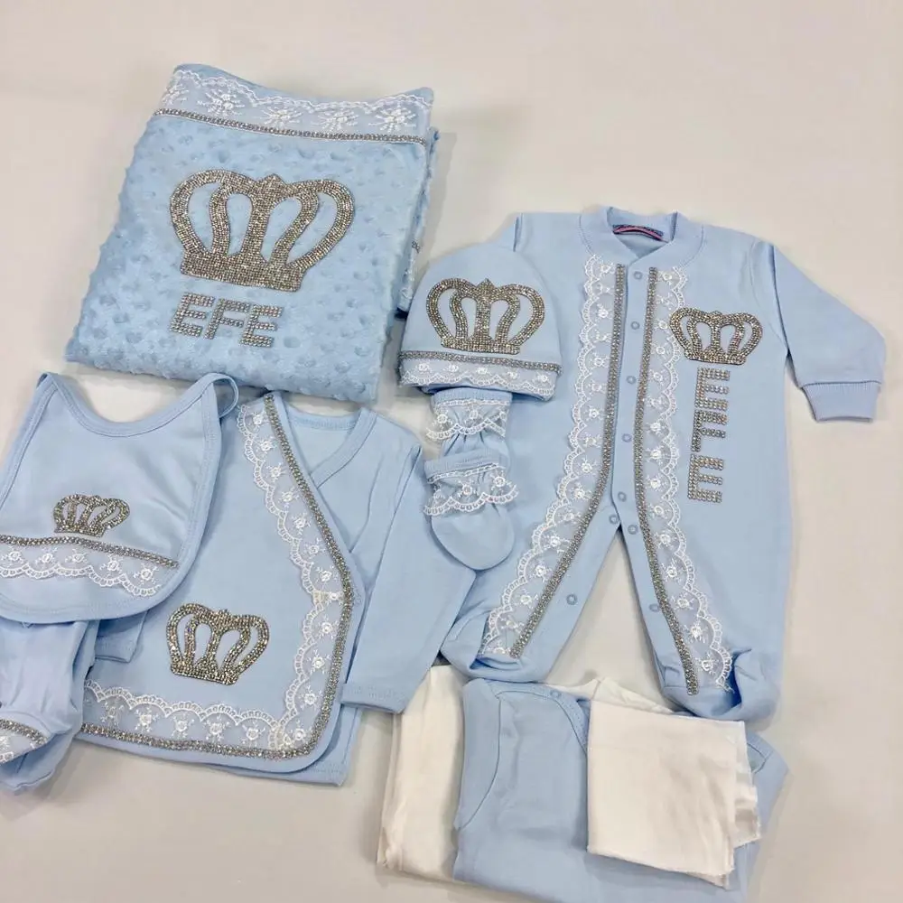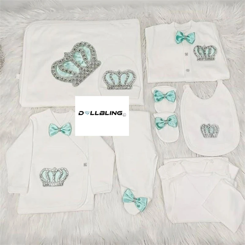 Nuestro juego de 10 piezas está hecho de algodón suave y grueso.Están adornados con botones de diamantes de imitación, joyas de corona y lazos.