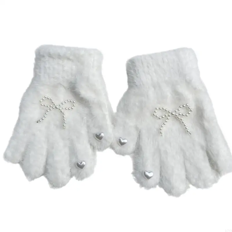D7YD Girls Guantes punto con perlas y diseño Bownot para edades 3-8T Soft y cálido Faux Mink Mink Fleece Finger Mittens