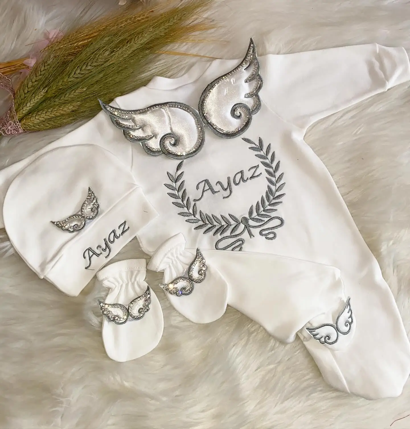 Nuestro Juego de 3 piezas está hecho de algodón suave y grueso. Ofrecemos servicio personalizado de nombre para trabajos de bordado.