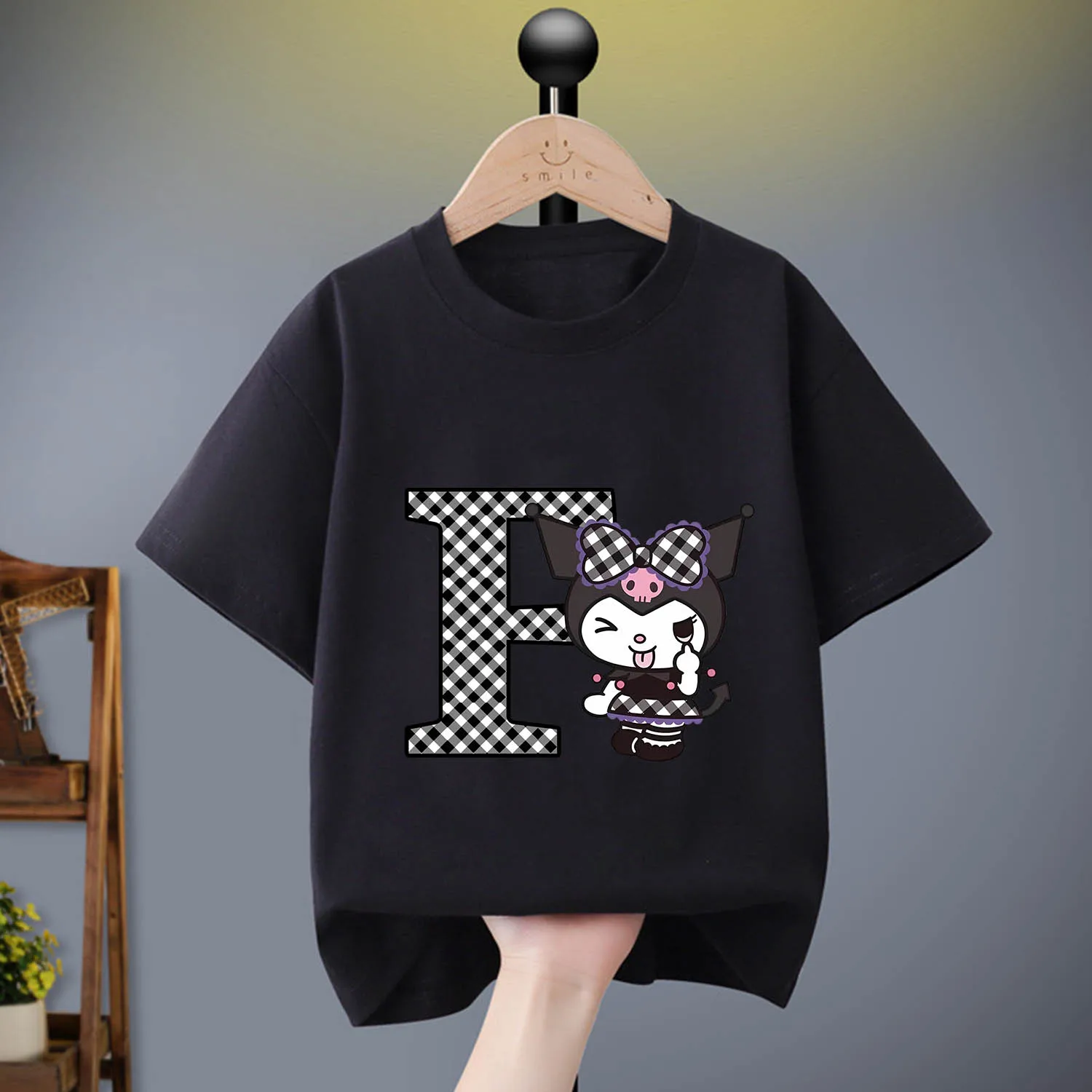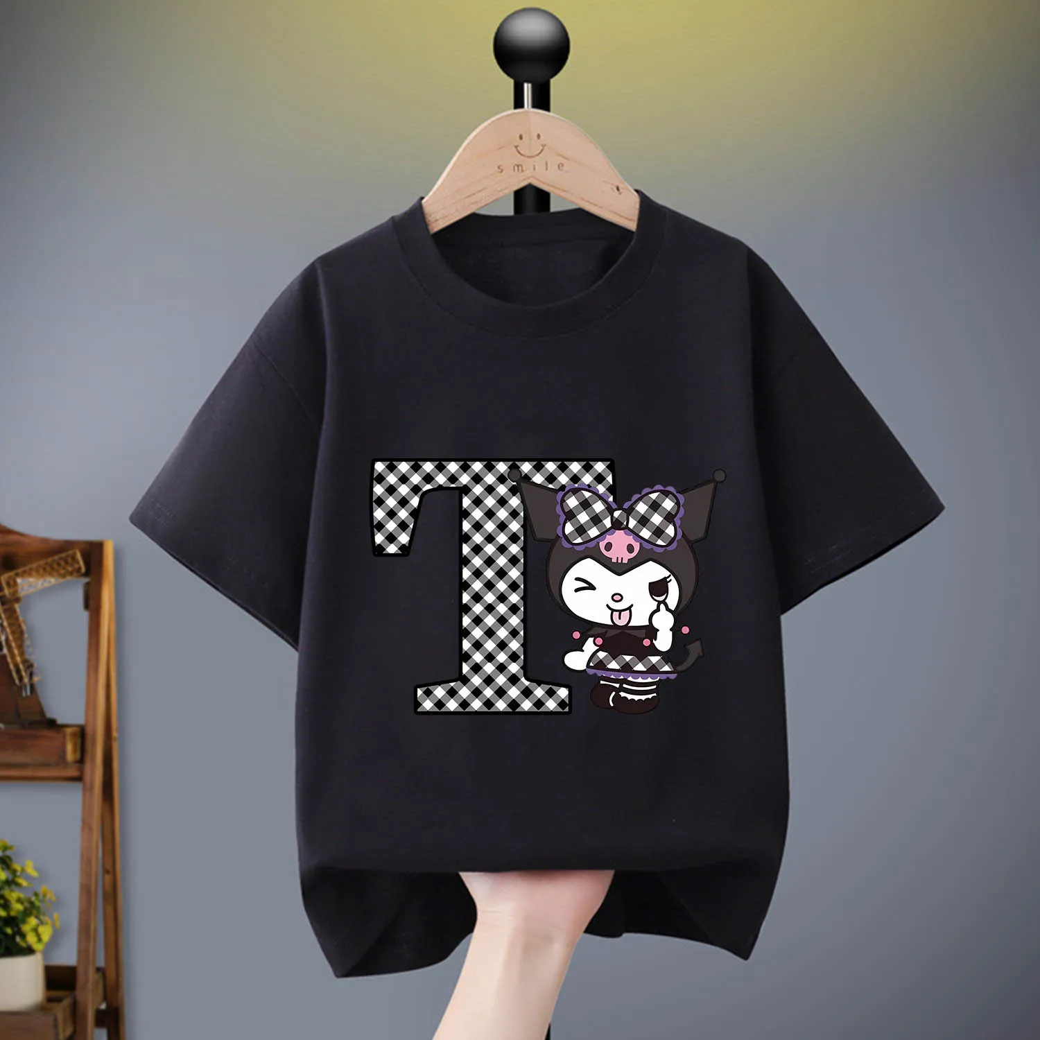Kuromi-Camiseta con el alfabeto de Sanrio para niños, ropa de dibujos animados, Tops de Base a la moda, ropa negra de algodón, regalo para bebés, 26
