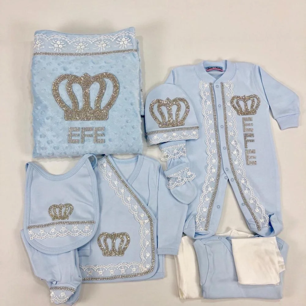Nuestro juego de 10 piezas está hecho de algodón suave y grueso.Están adornados con botones de diamantes de imitación, joyas de corona y lazos.