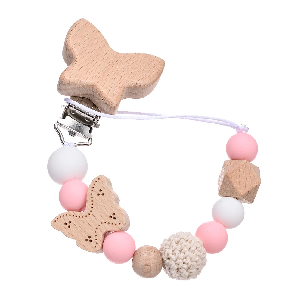 Nombre de personalización de haya, mariposa de madera, Clip de cadena para chupete de bebé, cuentas de mariposa, cuentas de silicona, soporte para pezones para regalo de recién nacido
