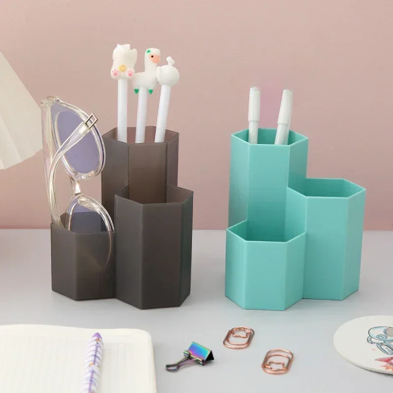 Organizador de escritorio Hexagonal Simple de gran capacidad, contenedor para bolígrafos, almacenamiento, taza para lápices, soporte con 3 ranuras, suministros escolares y de oficina
