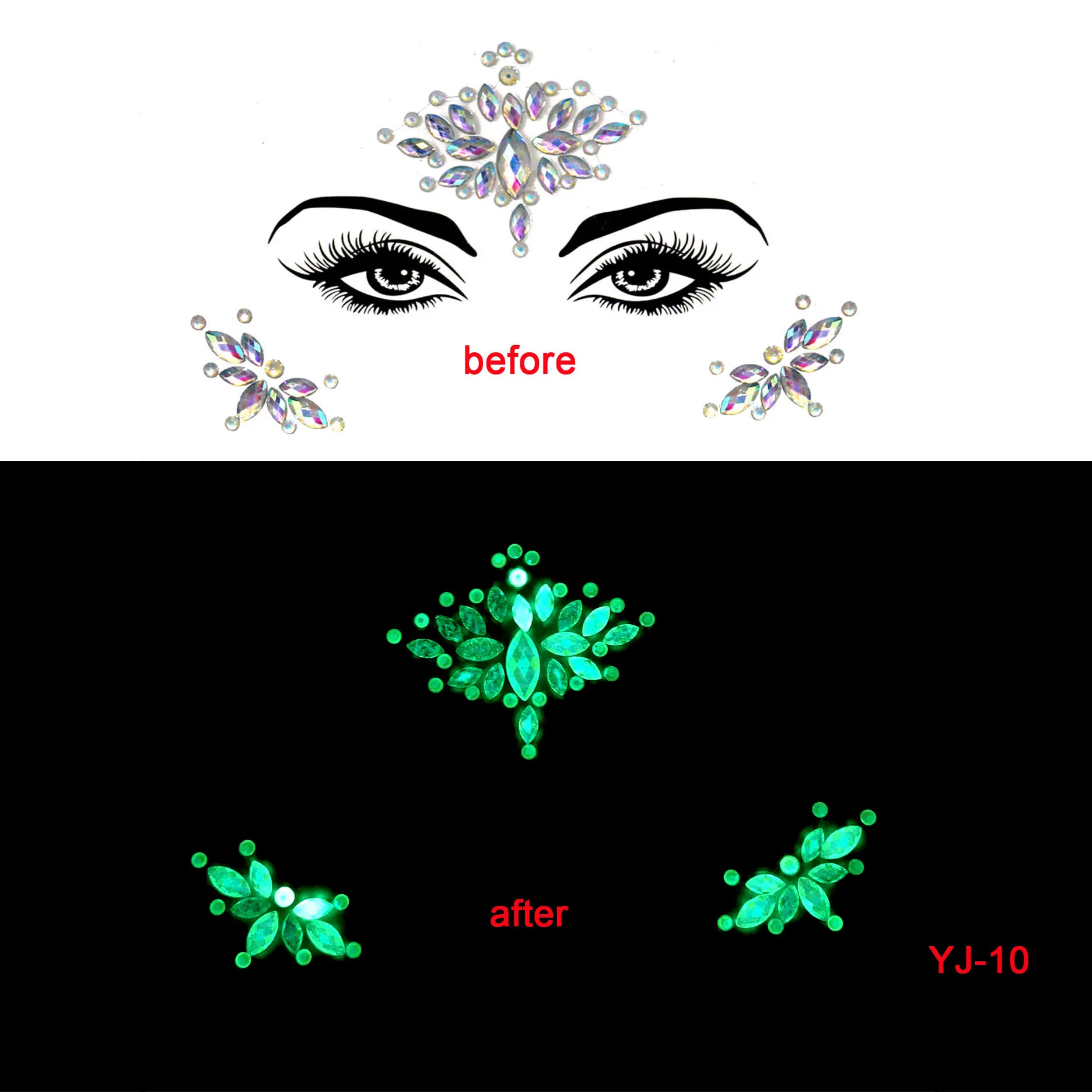 1. Incluso en la noche completamente oscura, la pegatina de joyería facial puede emitir luz brillante. Ilumine estas pegatinas con luz o luz solar antes de usarlas, lo que las hará brillar continuamente por la noche.