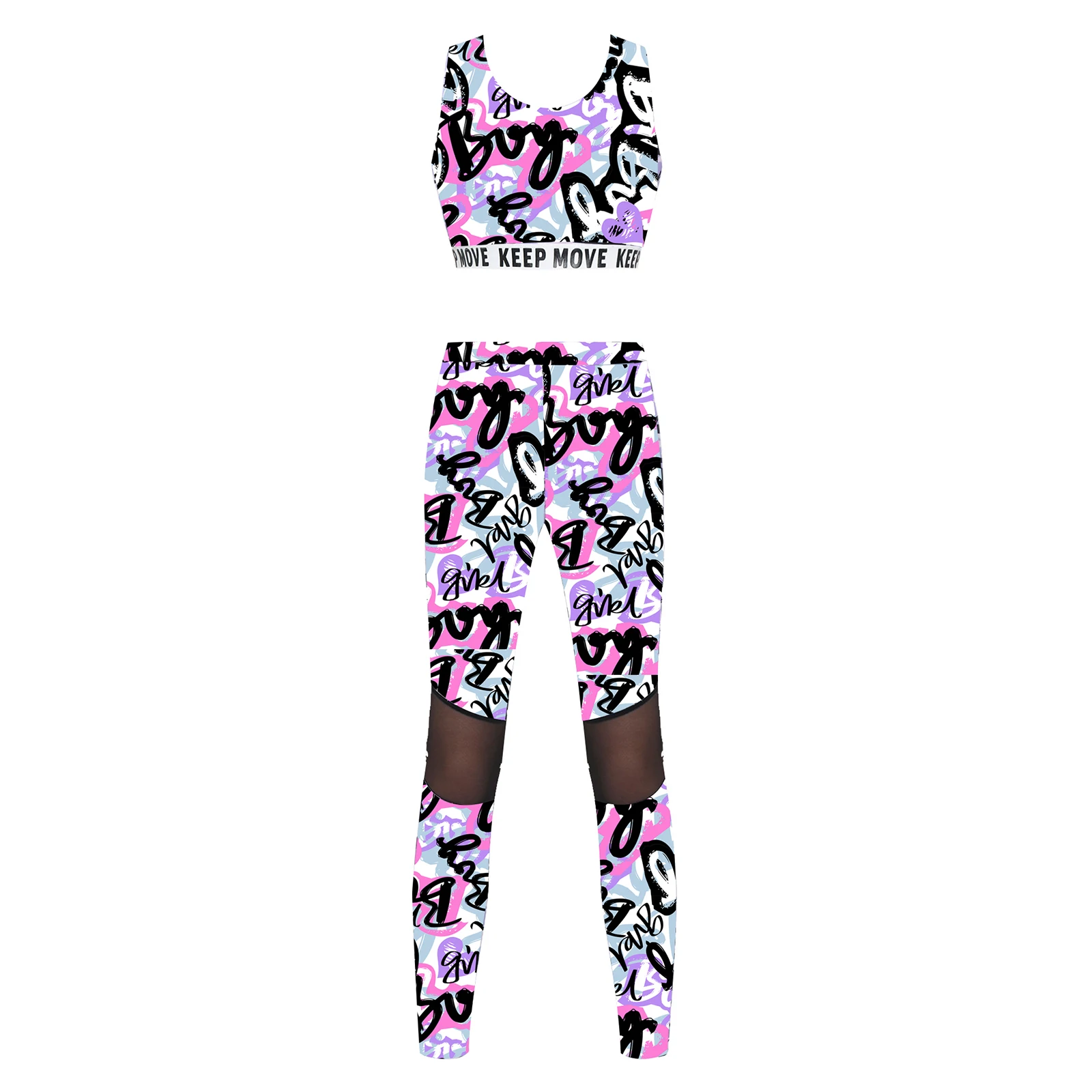 Top corto sin mangas con estampado de letras, escote redondo.Pantalón largo a juego con malla en la rodilla y cinturilla elástica.