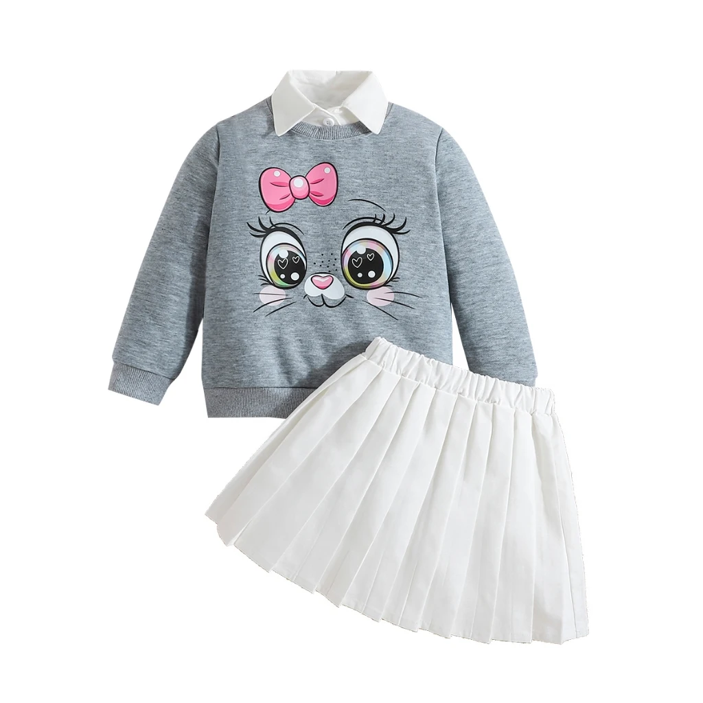 Ropa para niños para niña de 4 a 8 años, blusa con estampado bonito de dibujos animados de manga larga y Falda plisada elástica, ropa para niños pequeños