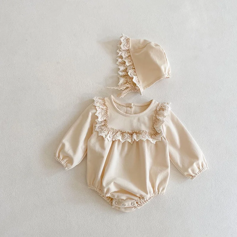 Ropa de primavera para niñas, traje infantil de una pieza con sombrero y volantes