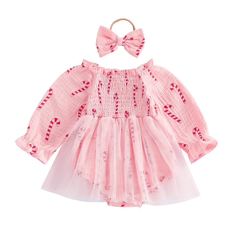 Baby Girl Christmas Romper Dress Candy Cane Print Long Sleeve Smocked Tulle Skirt Jumpsuit with Bow Headband