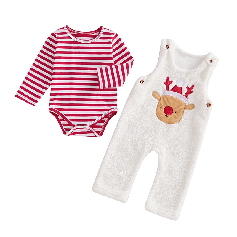 Conjunto navideño para niñas pequeñas, mameluco de manga larga a rayas y monos con parche de alce, pantalones, conjunto de ropa cálida