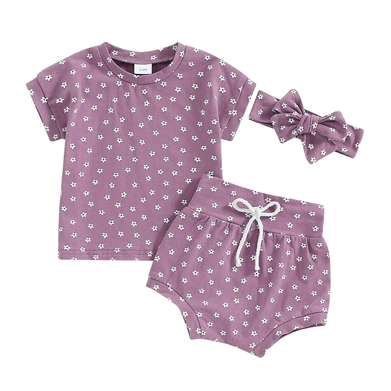Ropa de verano para niña, camiseta de manga corta con cuello redondo y estampado de flores con pantalones cortos y traje de diadema
