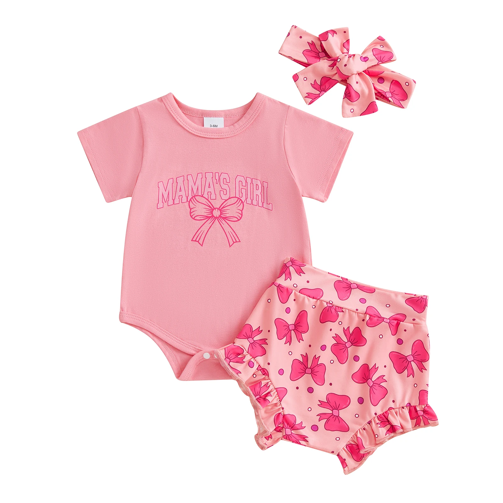 SUNSIOM Conjunto de mameluco de manga corta con estampado de letras para el día de la madre para niña + pantalones cortos con estampado de lazo en la cintura elástica + conjunto de diadema