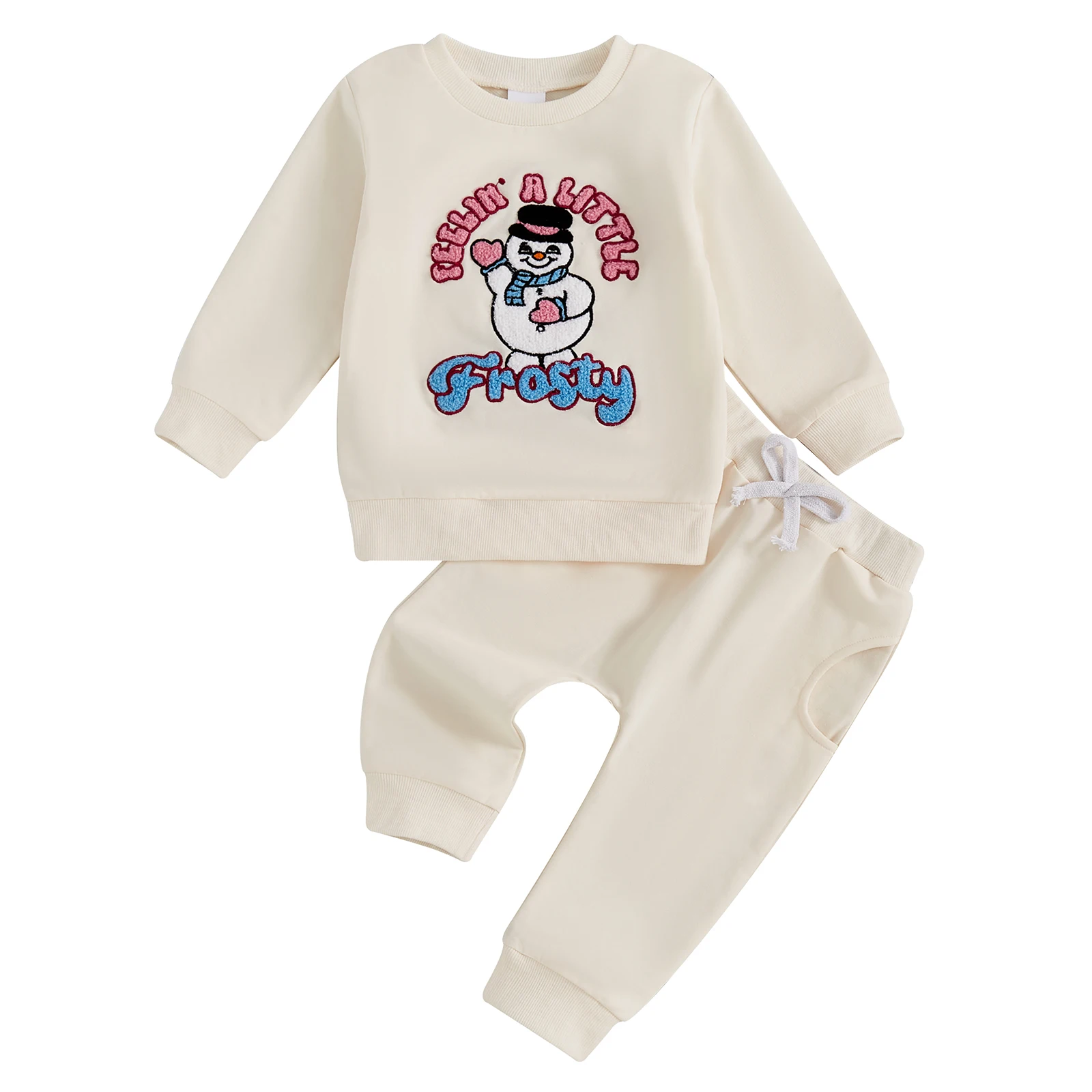 SUNSIOM Conjuntos navideños de 2 piezas para niñas pequeñas, manga larga, cuello redondo, letra, sombrero de Papá Noel/letras, muñeco de nieve, bordado, tops, pantalones con cordón