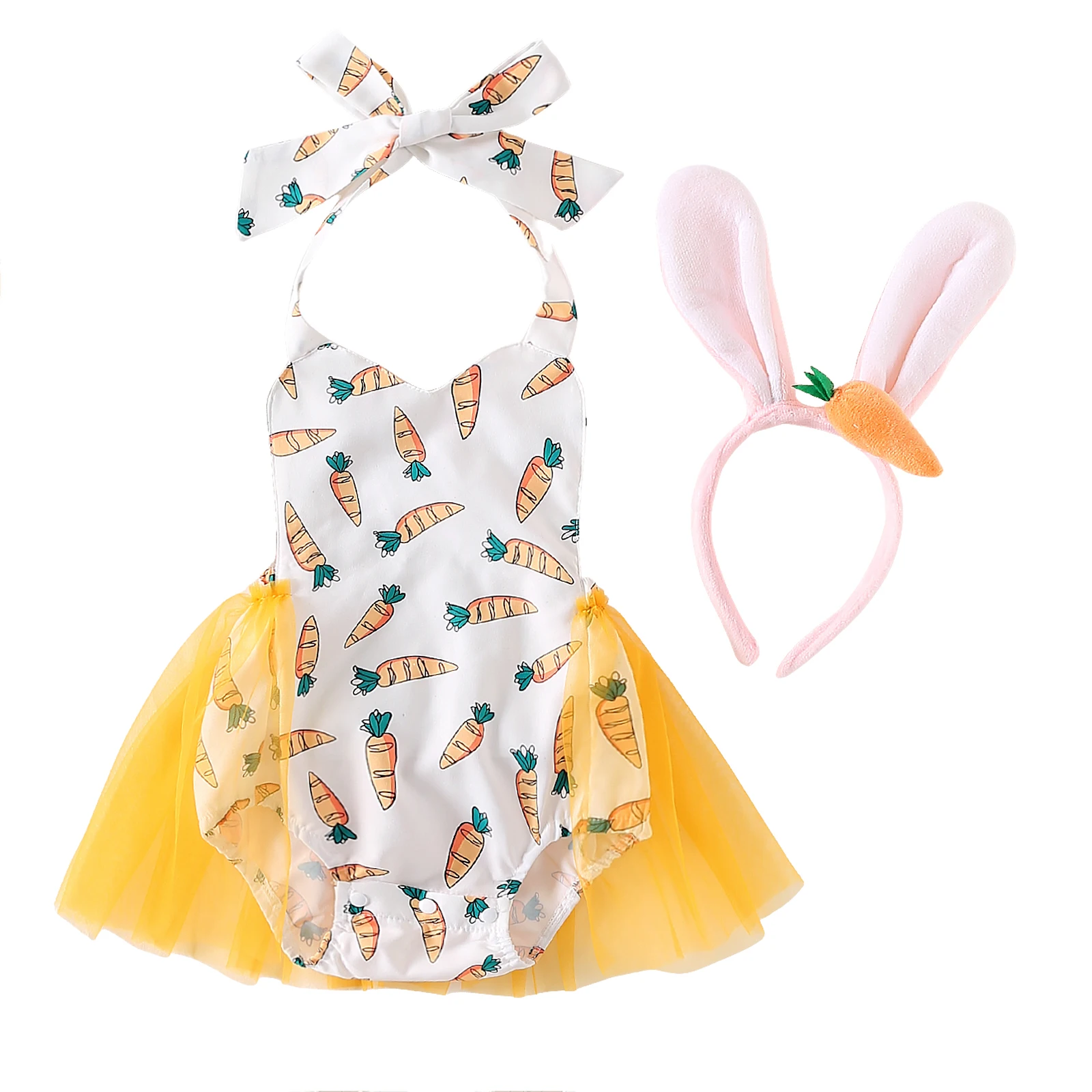 Mameluco halter de Pascua para niñas, mono de tul sin mangas con estampado de zanahoria/conejo y diadema con orejas de conejo