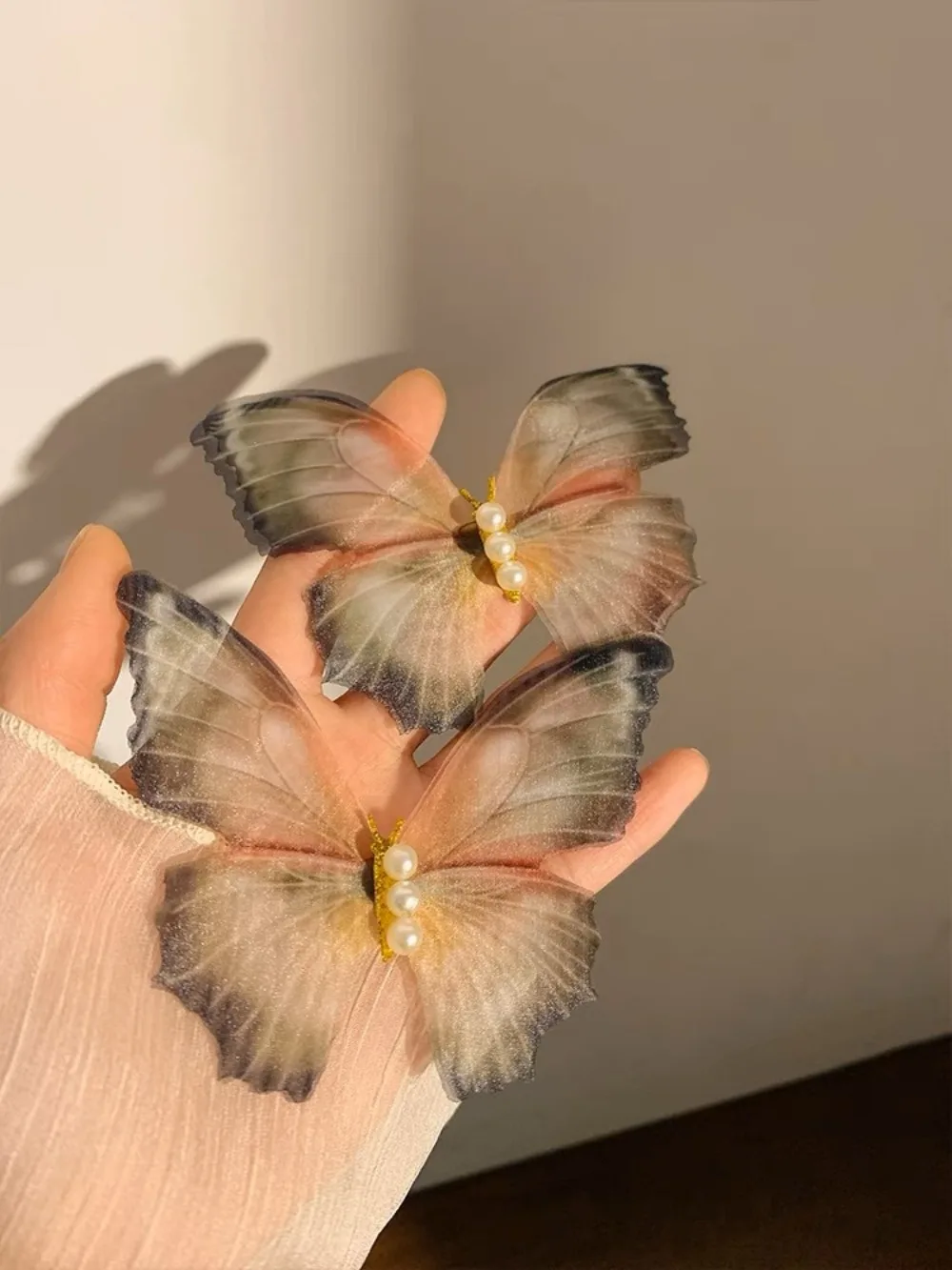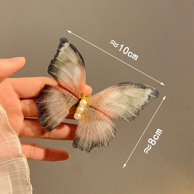 Pinzas para el cabello coloridas con mariposas móviles para niñas, lindos accesorios para el cabello para niños, horquillas con lazo de organza de cambio gradual Pinza dinamica de gasa con forma de mariposa, perla de Hada, temperamento de estilo antiguo, accesorios para el cabello femenino, regalo al por mayor