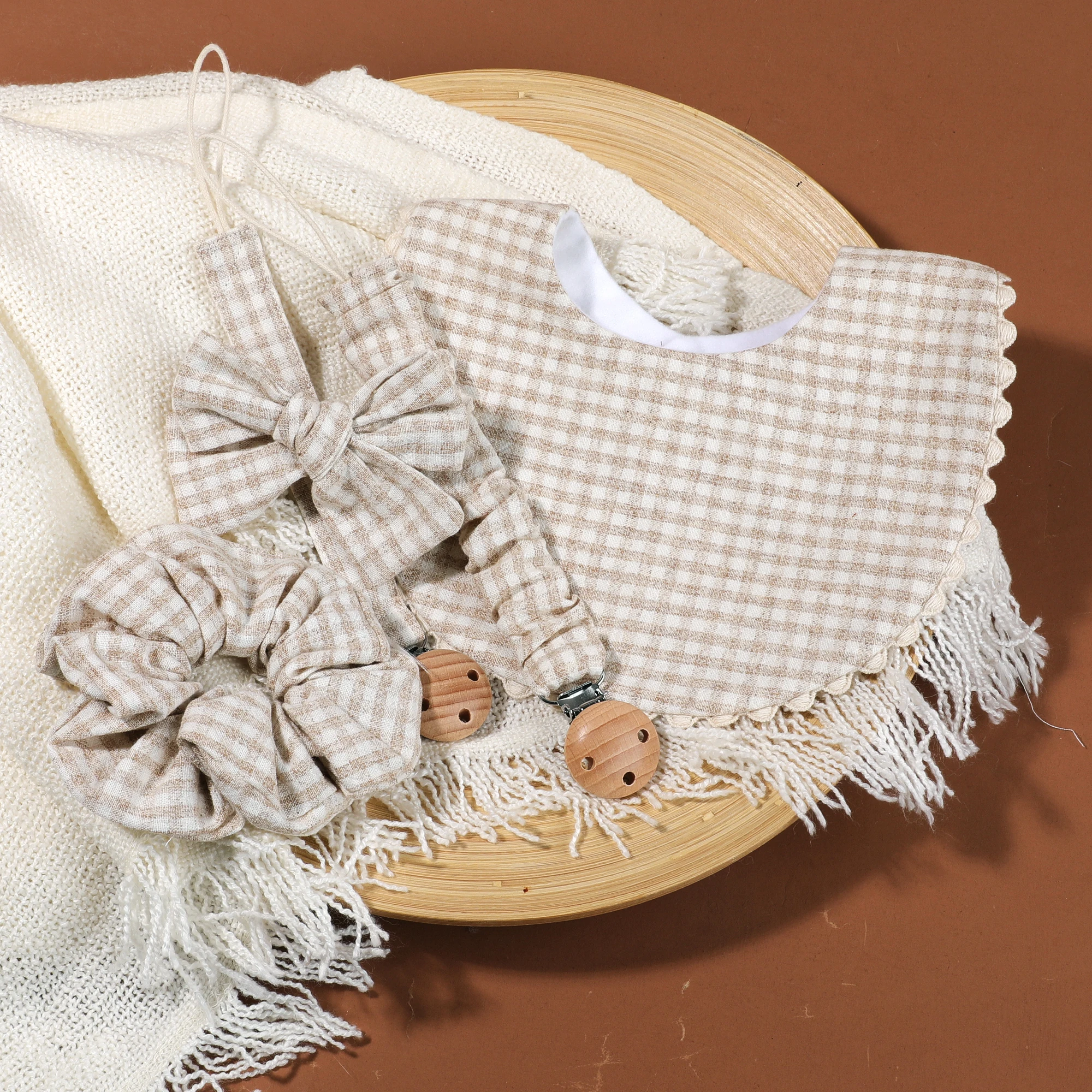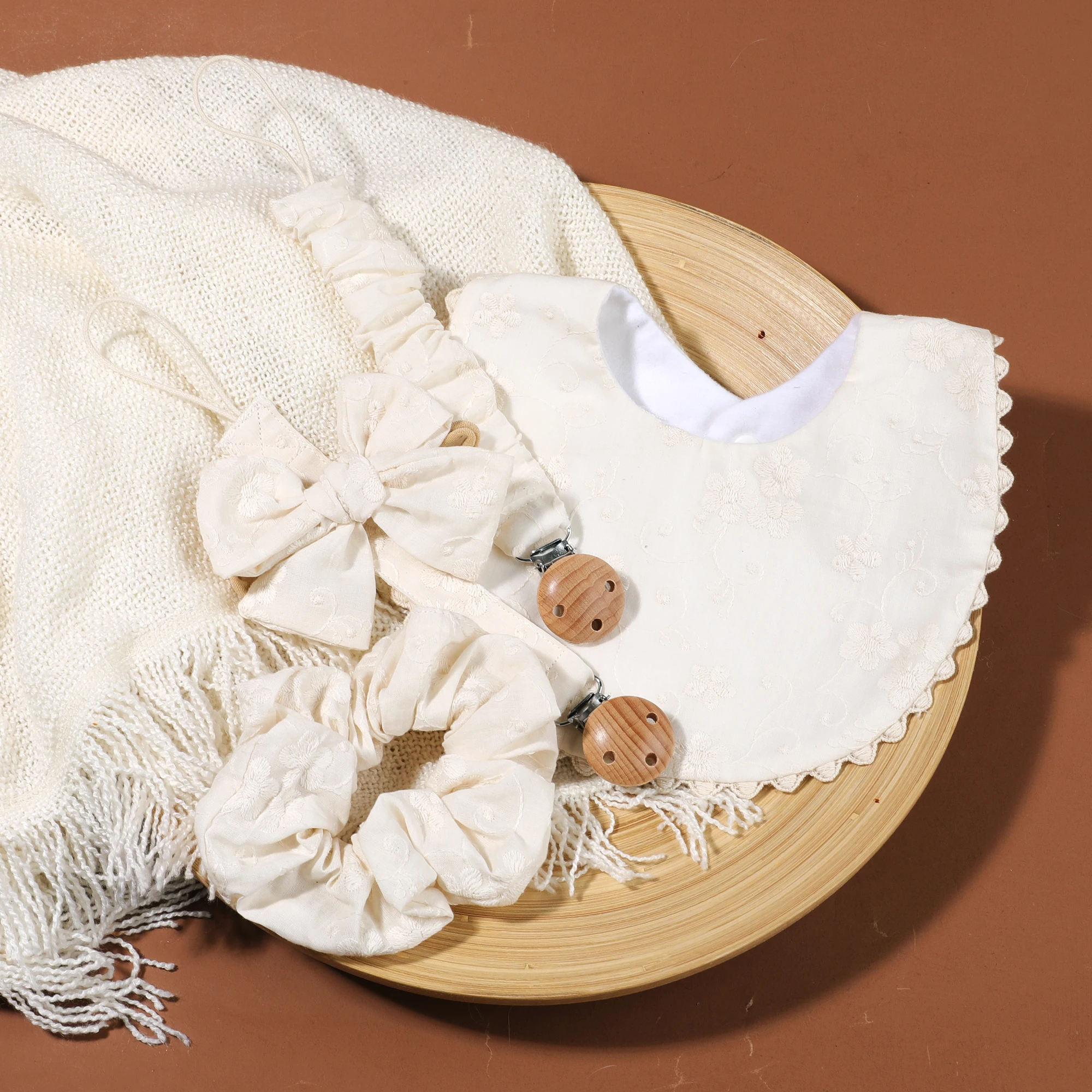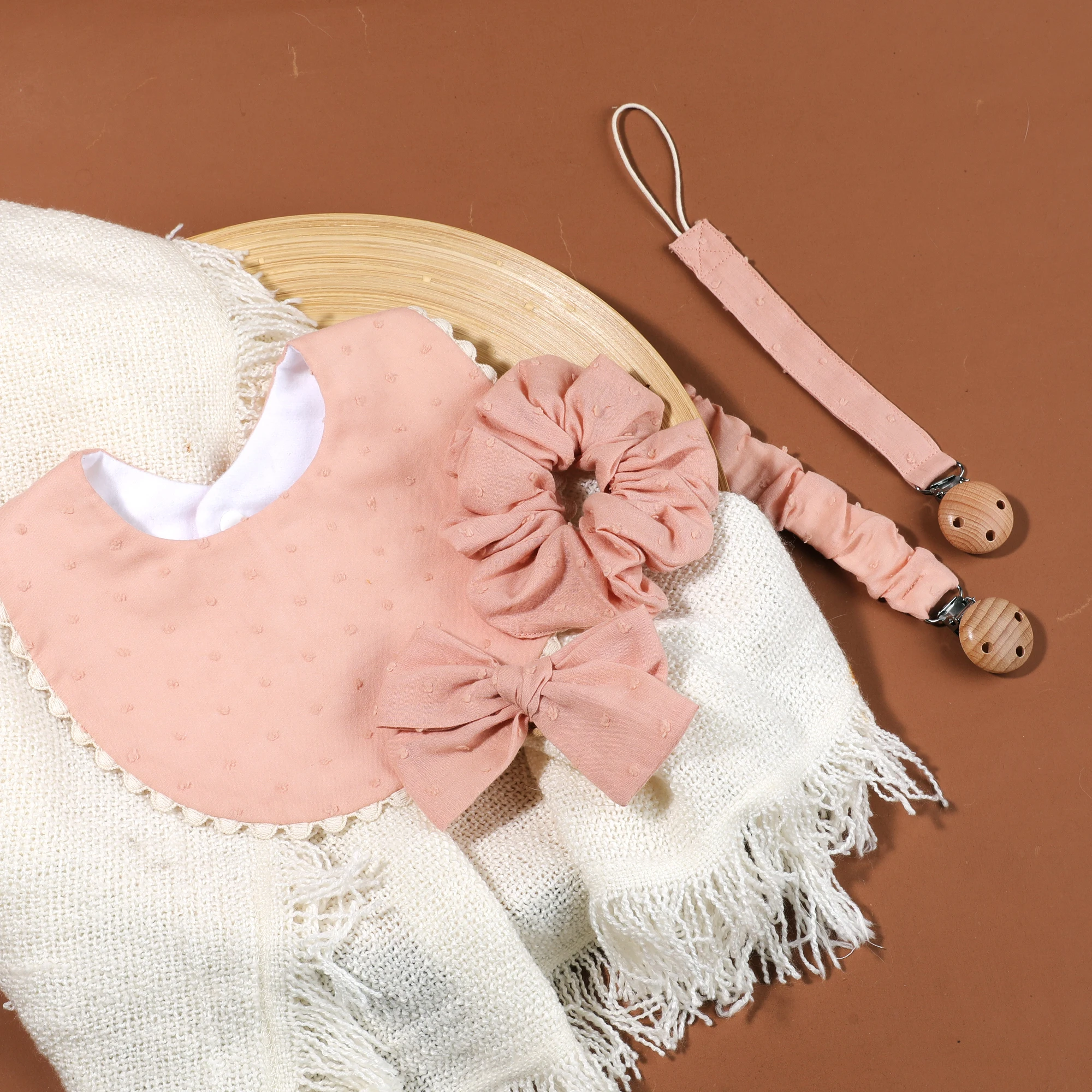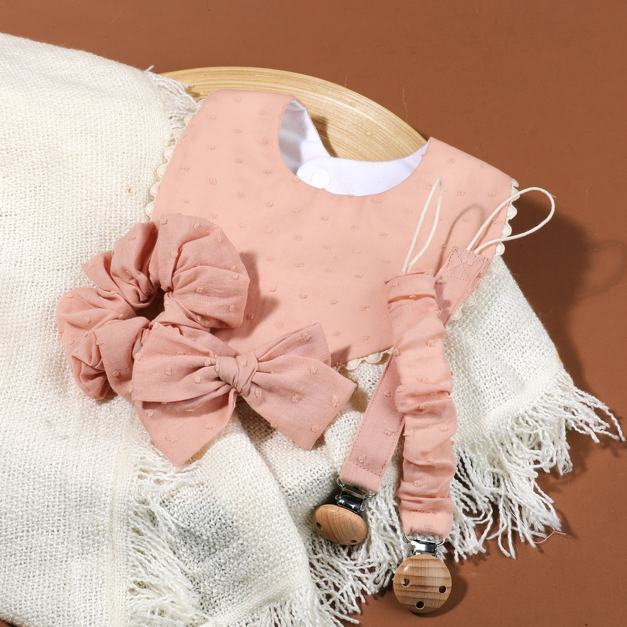 Comprar 1 Juego de Clips para chupete de bebé de algodón seguro, cadena de madera, soporte para pezones para niñas con babero de alimentación a juego, diadema con lazo, accesorios para bebé