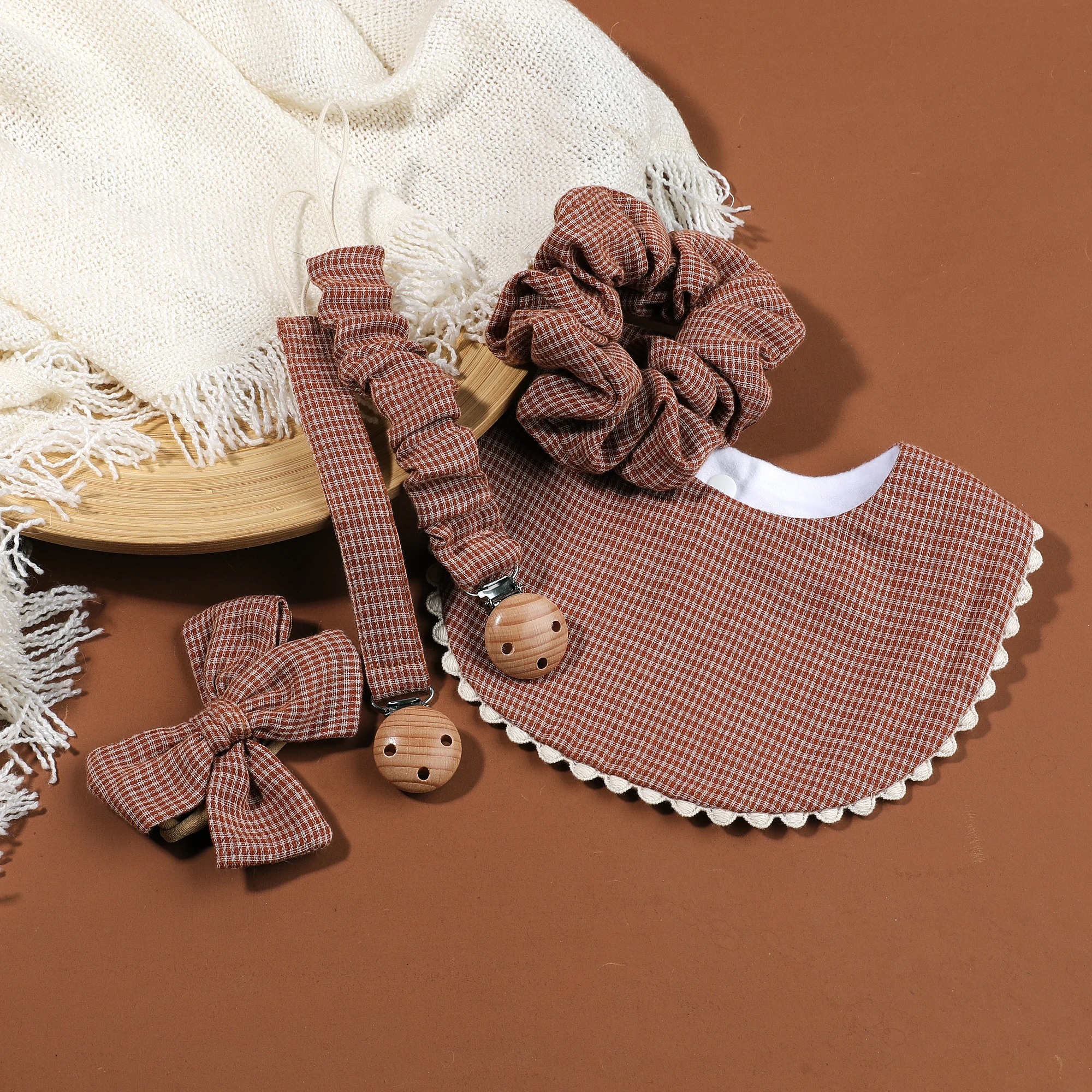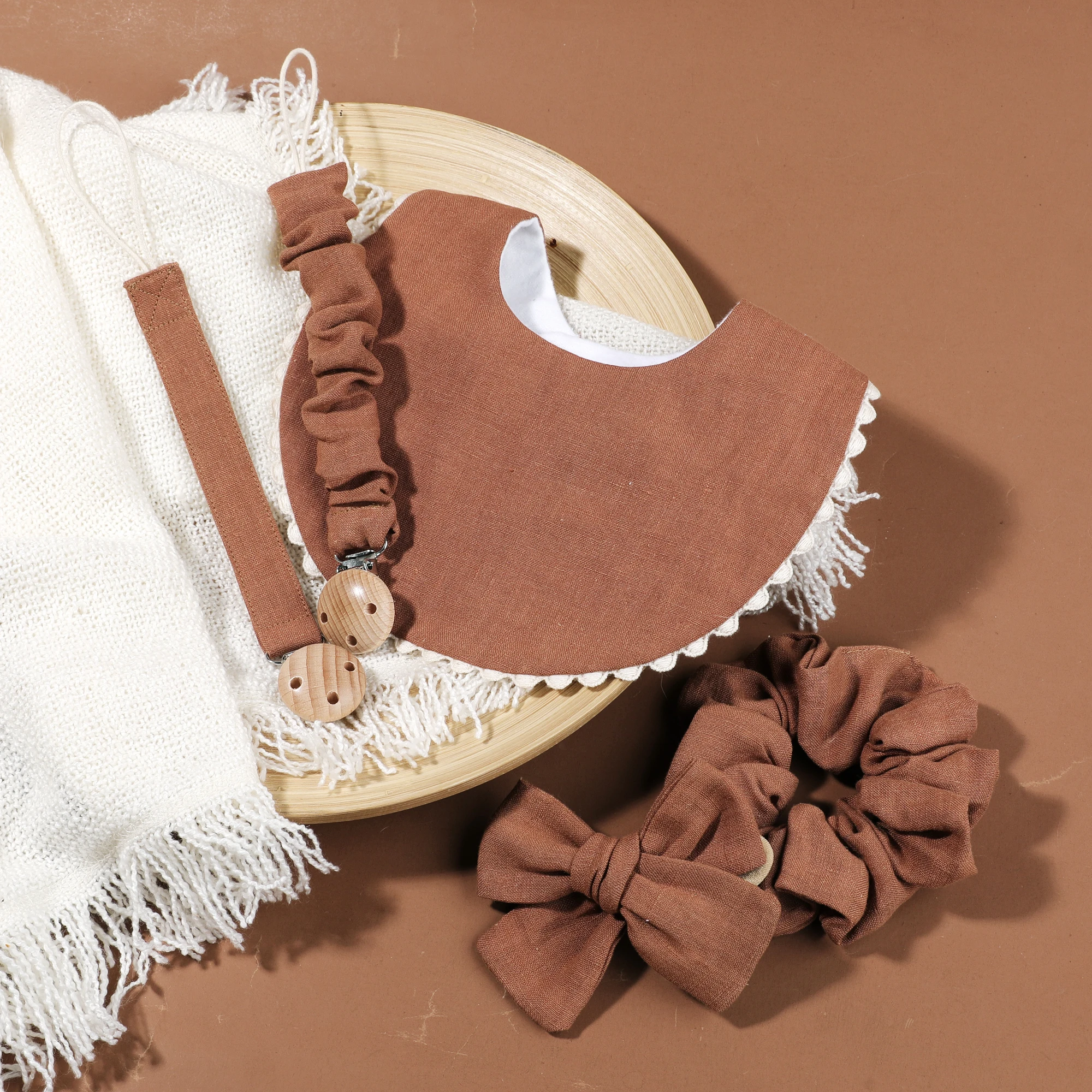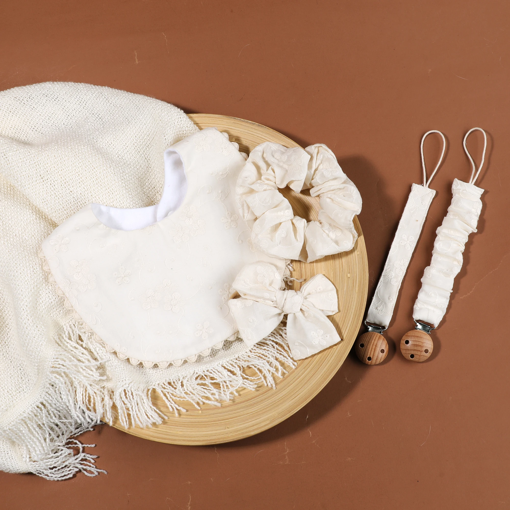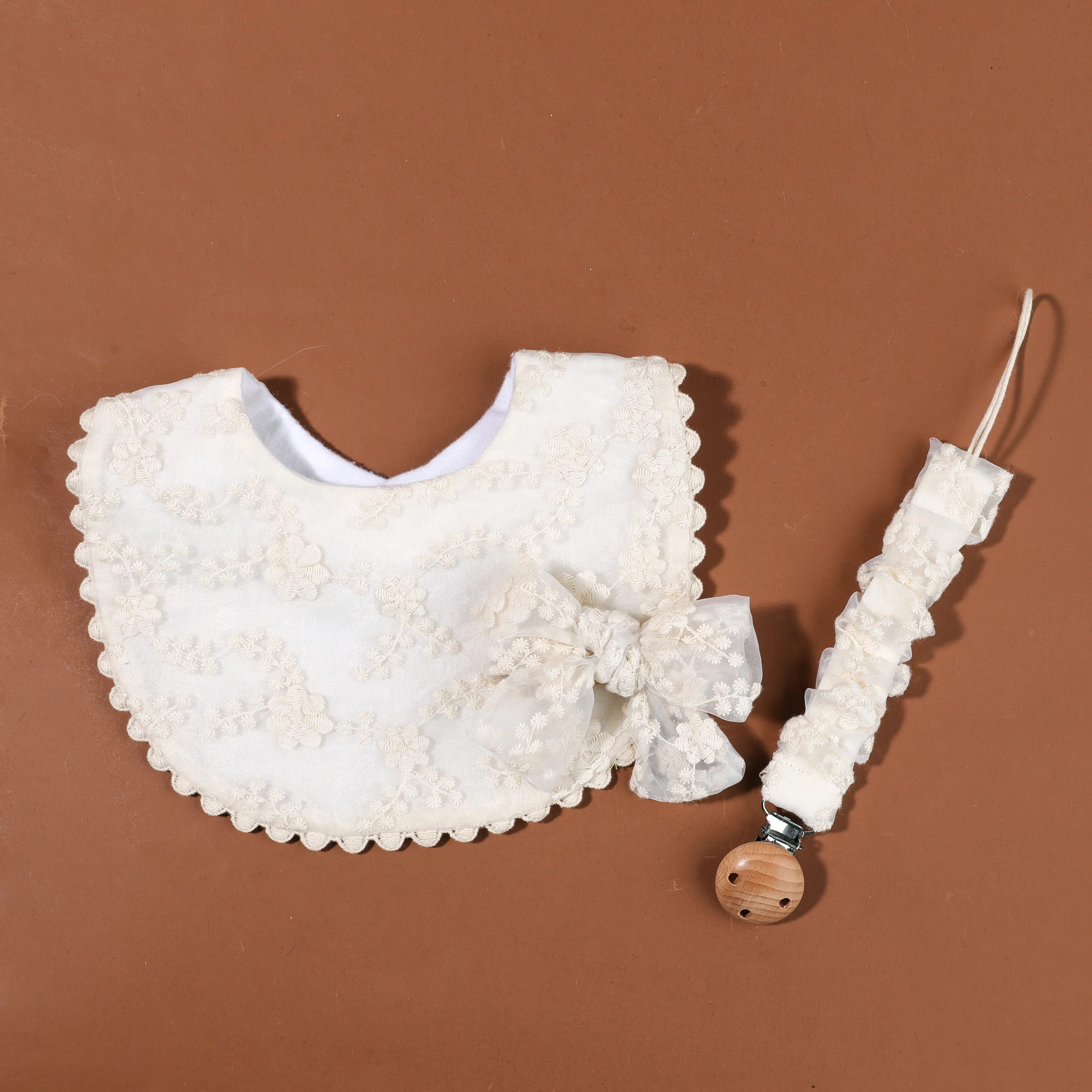Comprar 1 Juego de Clips para chupete de bebé de algodón seguro, cadena de madera, soporte para pezones para niñas con babero de alimentación a juego, diadema con lazo, accesorios para bebé