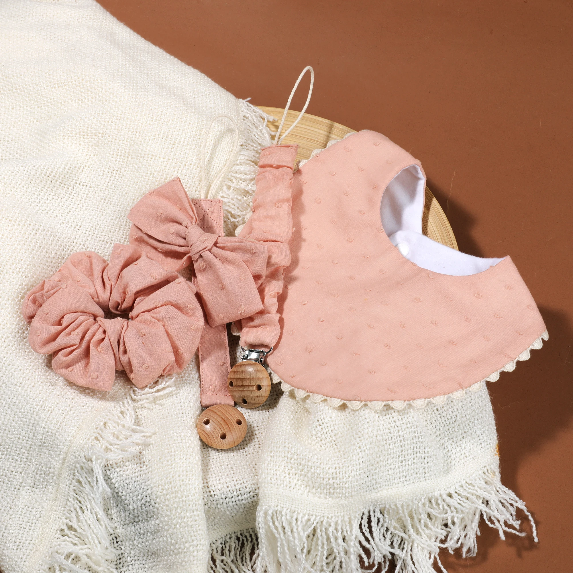 TIPO F (3 piezas): 1 babero + 1 cadena para chupete + 1 diadema con lazo