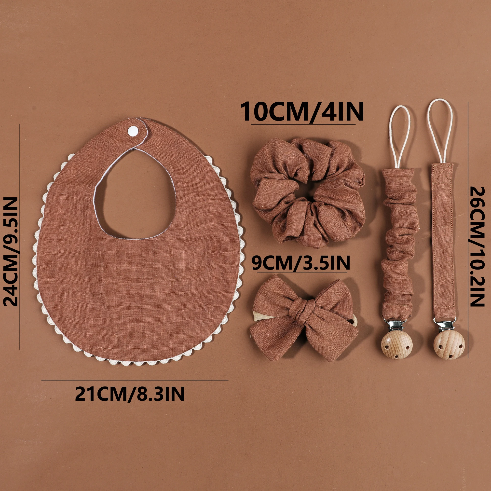 TIPO A TIPO E (5 piezas): 1 babero para bebé + 2 cadenas para chupete + 1 lazo para el cabello + 1 diadema con lazo