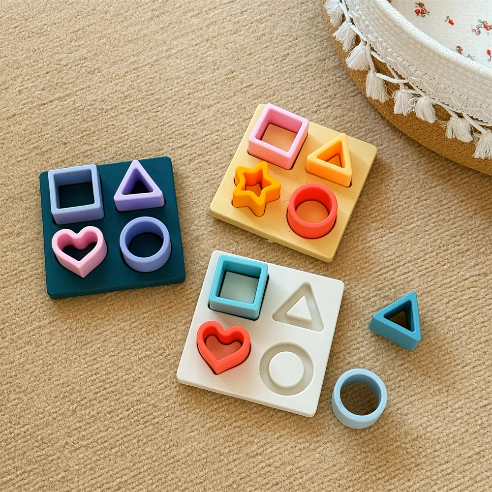 Color niños 1 Uds. Mordedor de bebé sin BPA juguete Montessori tablero de rompecabezas sensorial juguete de masticar geométrico de silicona juguete de aprendizaje de 0 a 3 años