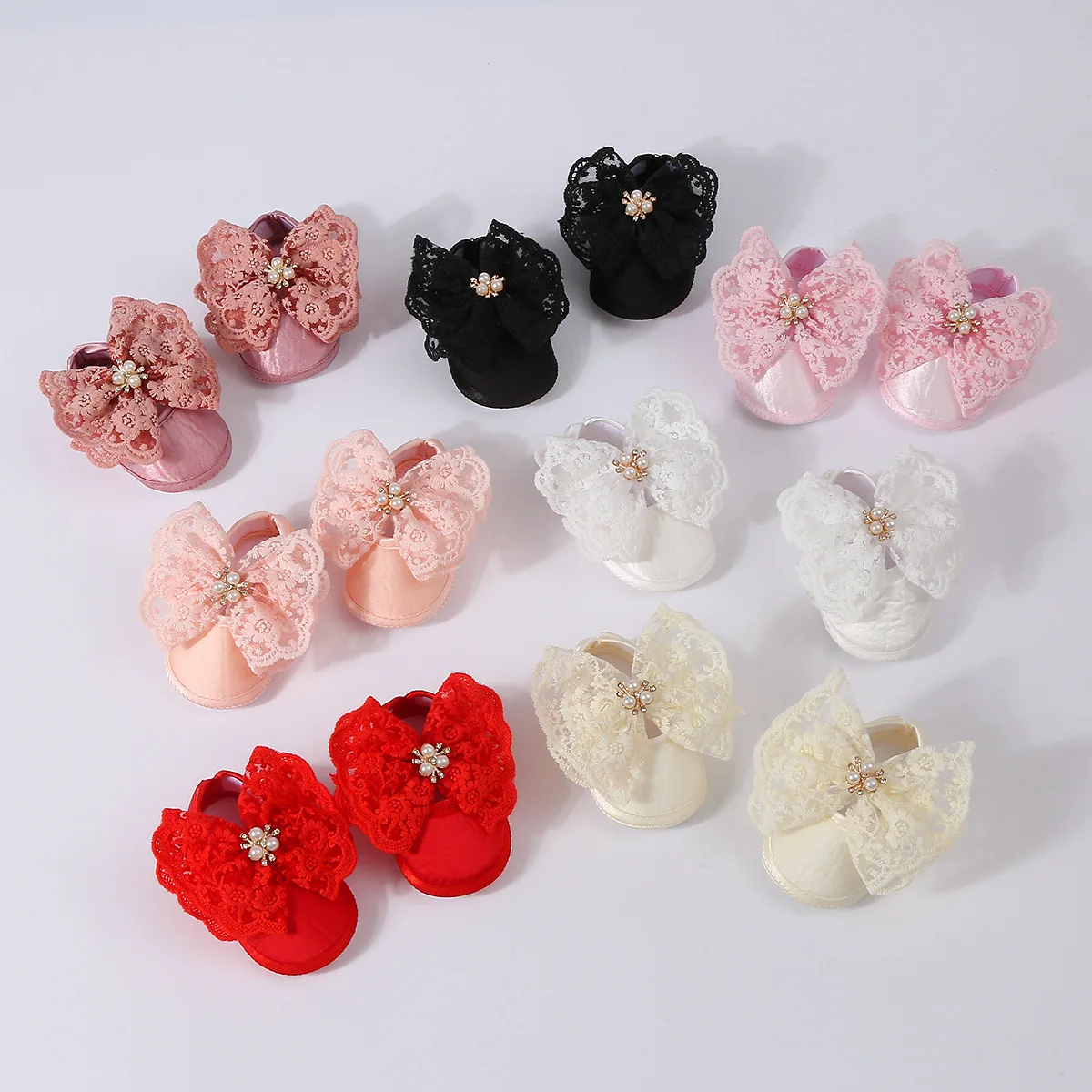 Comprar 1 Juego de zapatos bonitos de encaje con lazo grande y perlas para bebé, diadema para recién nacidos, zapatos para antes de caminar, calcetines de suelo sólidos, calcetines para niñas y niños, tocados