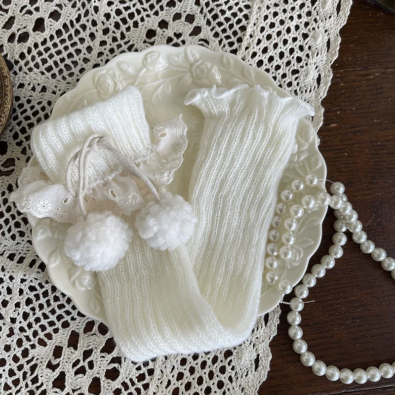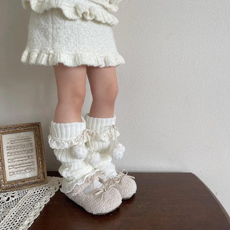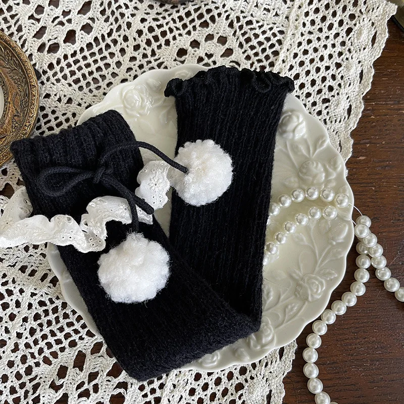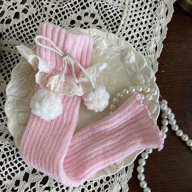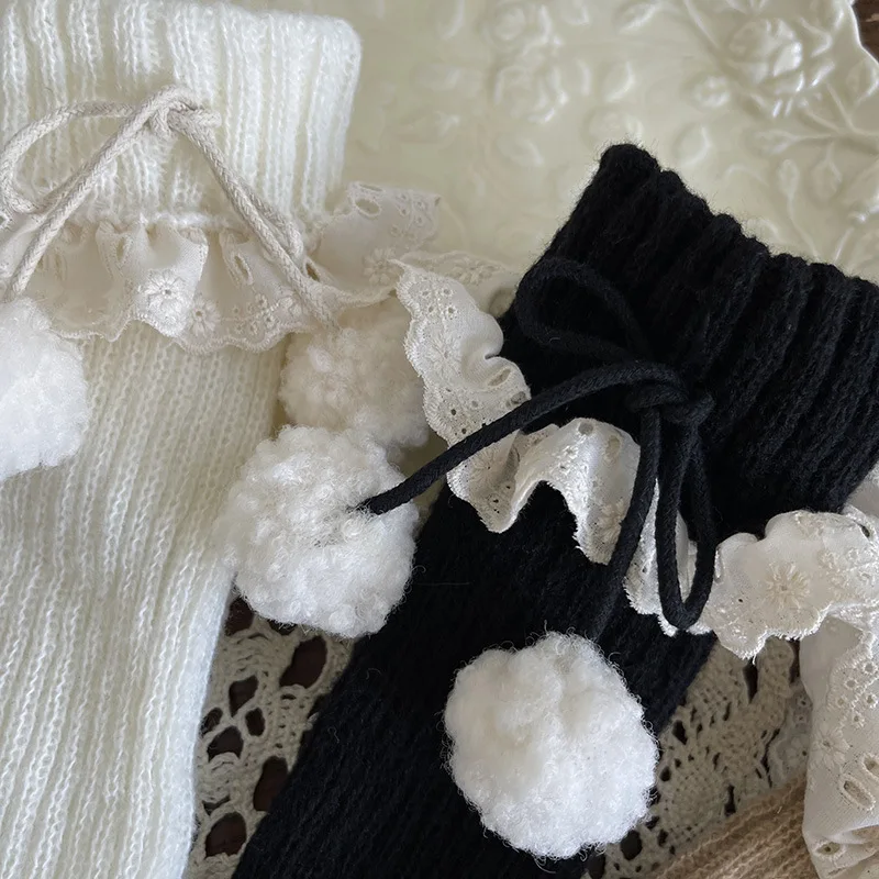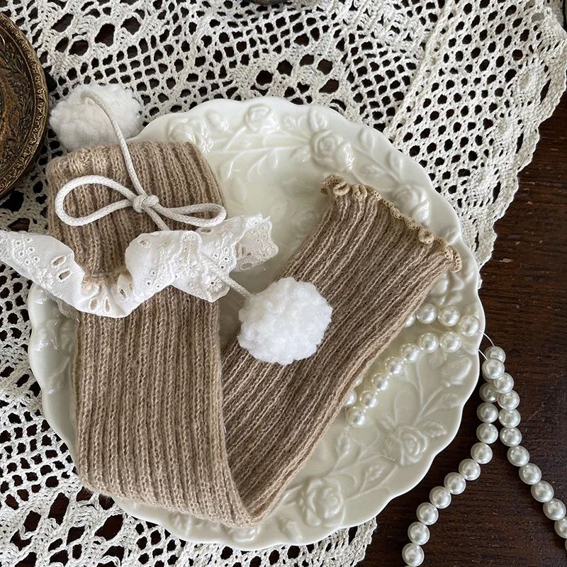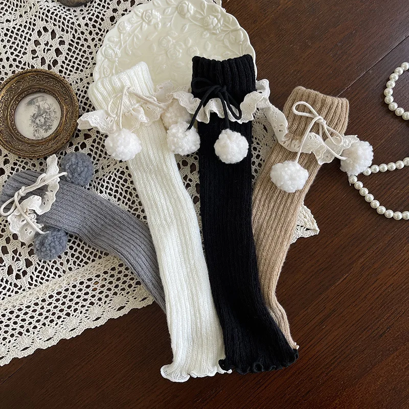 Comprar 1 par de calcetines bordados de Color crema, puños, bola de lana de cordero, adornos de encaje, calentadores de piernas para niñas, nuevos calcetines térmicos de invierno para estudiantes
