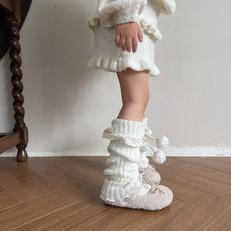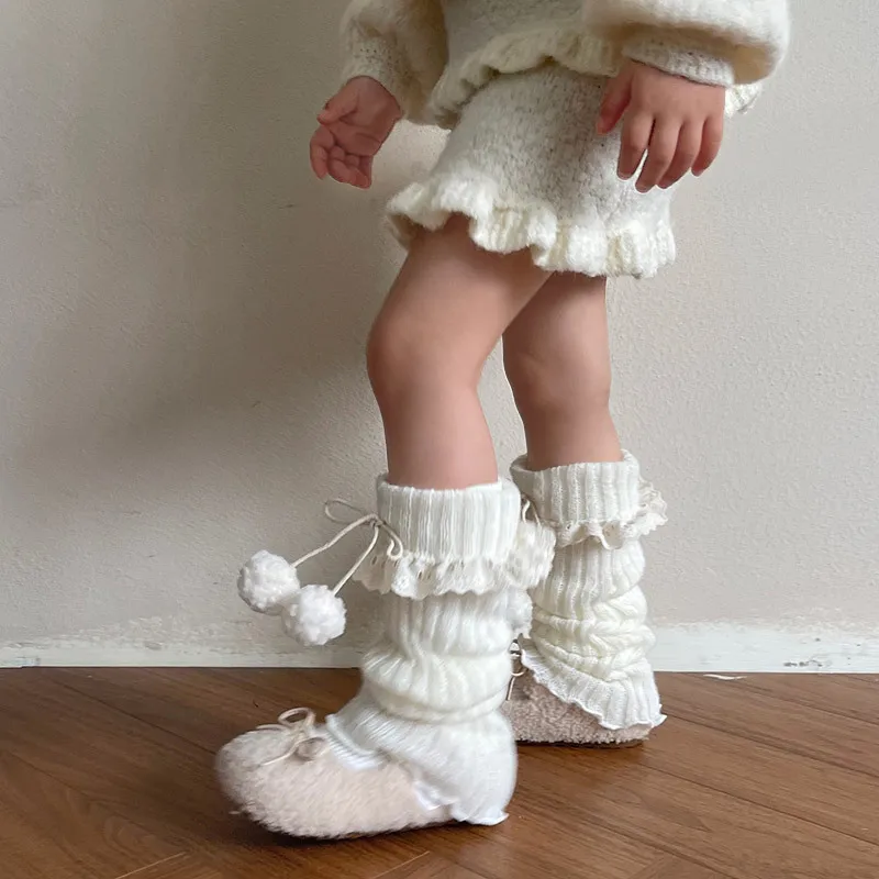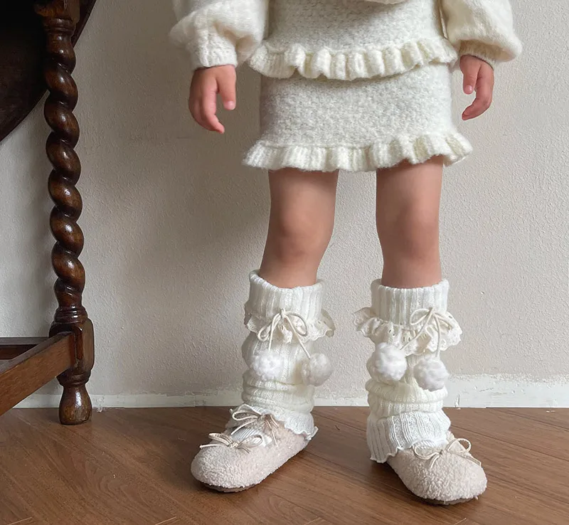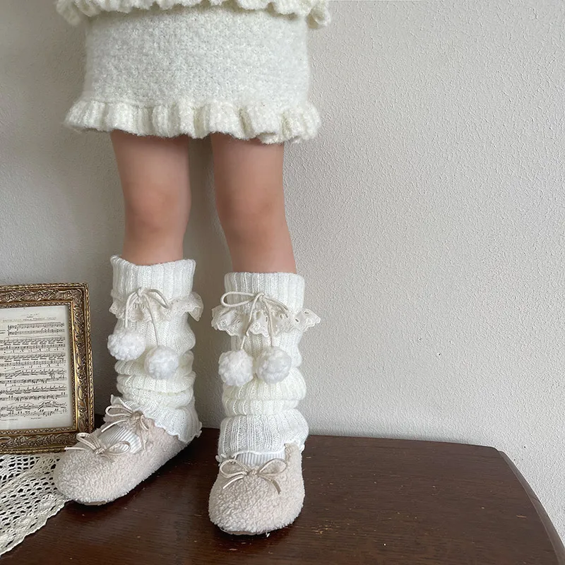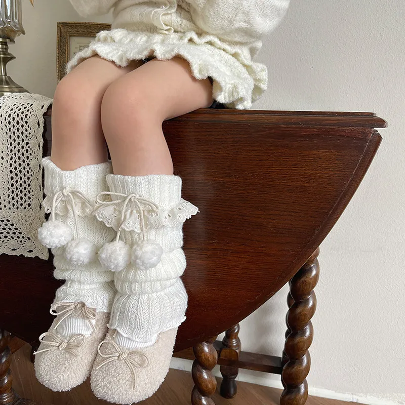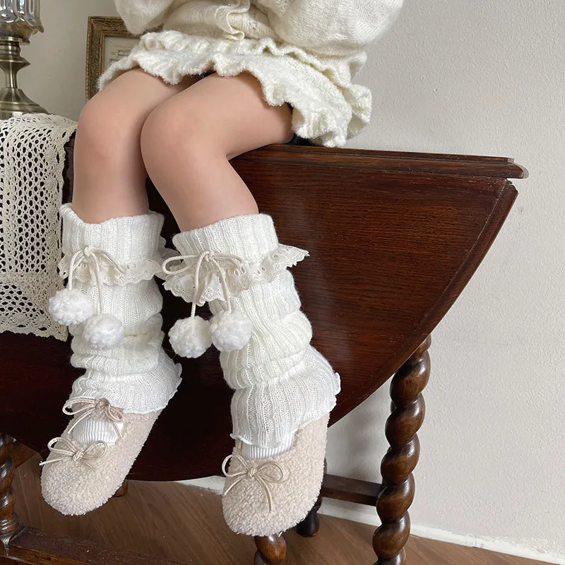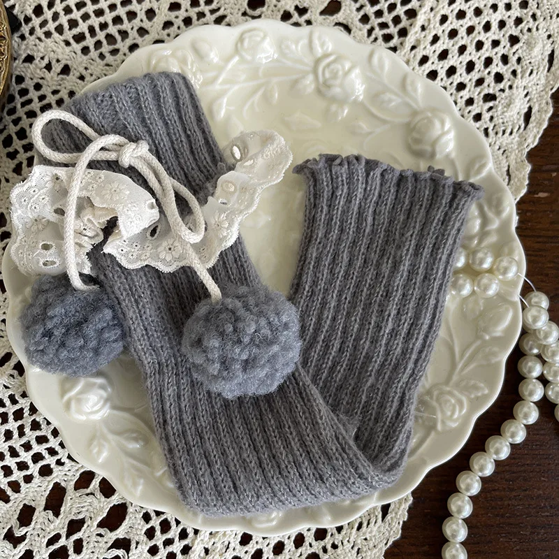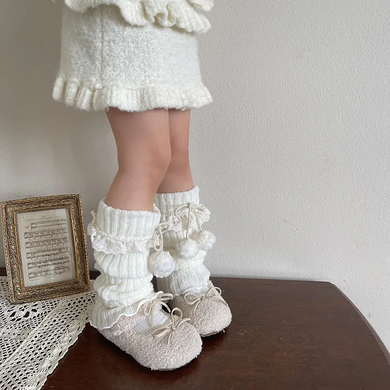 Comprar 1 par de calcetines bordados de Color crema, puños, bola de lana de cordero, adornos de encaje, calentadores de piernas para niñas, nuevos calcetines térmicos de invierno para estudiantes