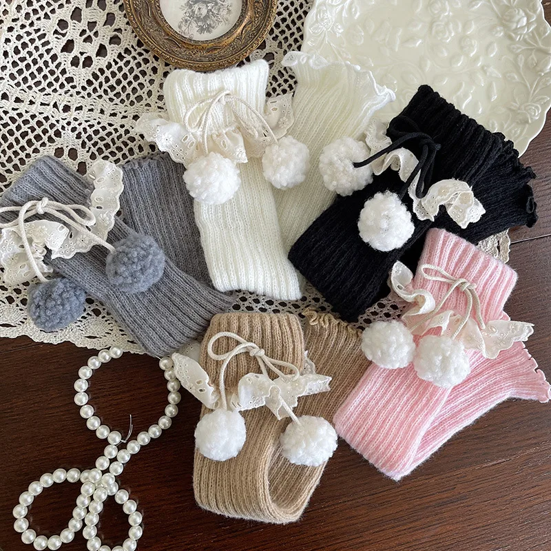 Comprar 1 par de calcetines bordados de Color crema, puños, bola de lana de cordero, adornos de encaje, calentadores de piernas para niñas, nuevos calcetines térmicos de invierno para estudiantes