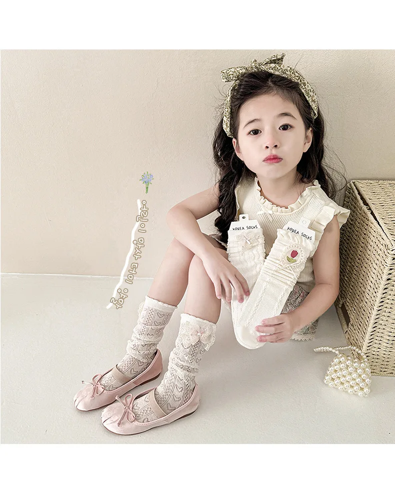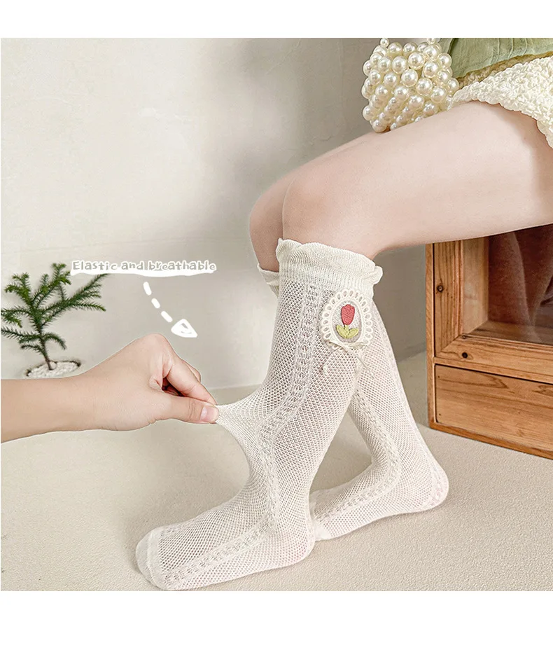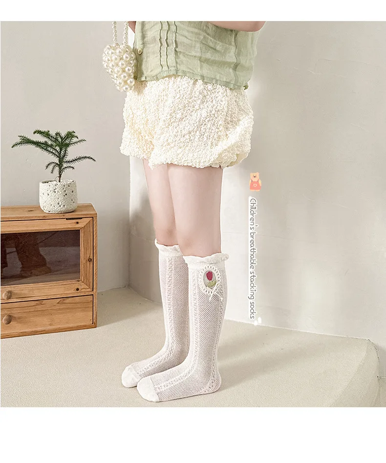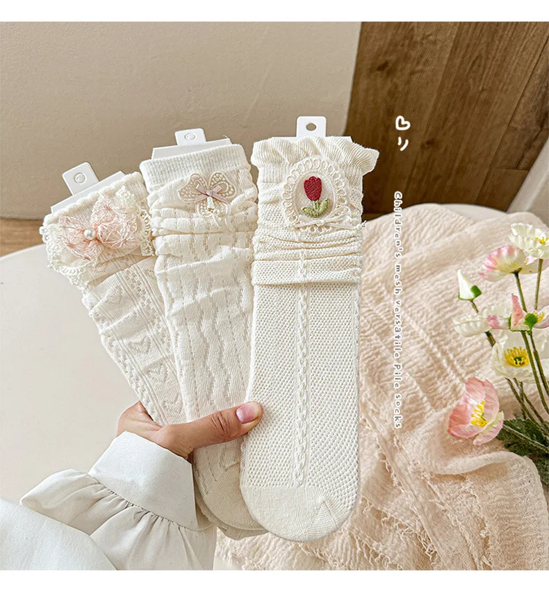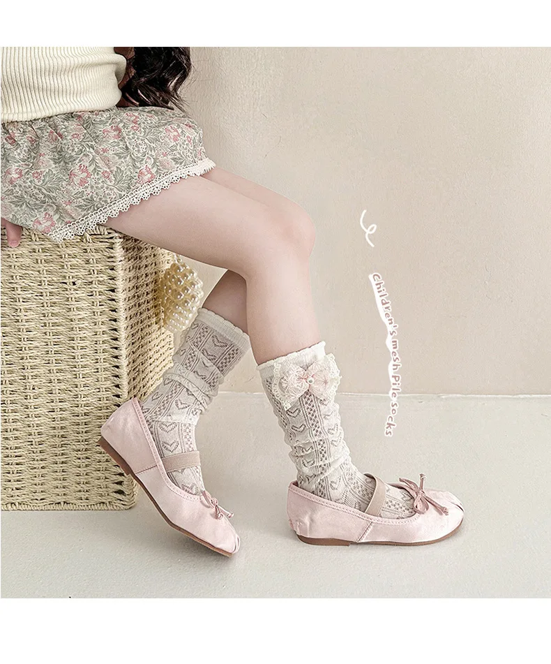 1 par de calcetines hasta la pantorrilla de encaje Floral dulce para niños niña Color Beige arco corazón hueco calcetín para niños Primavera Verano calcetín fino transpirable