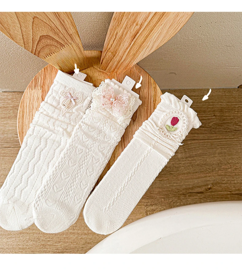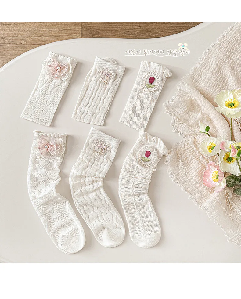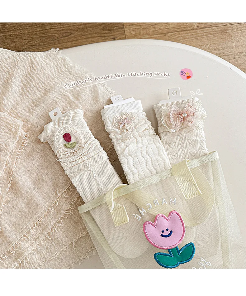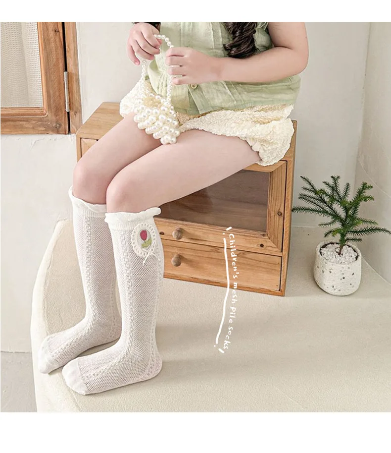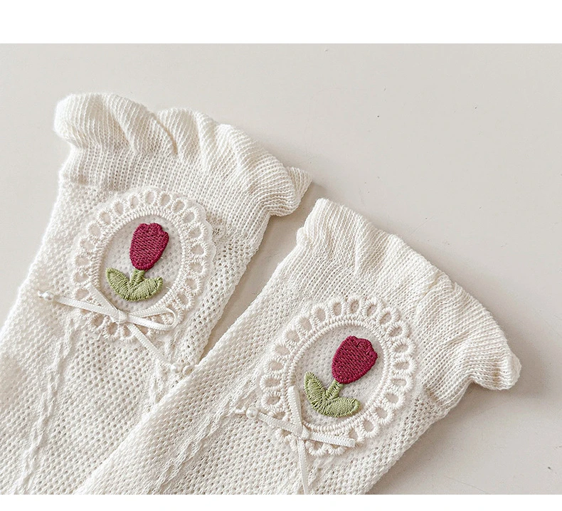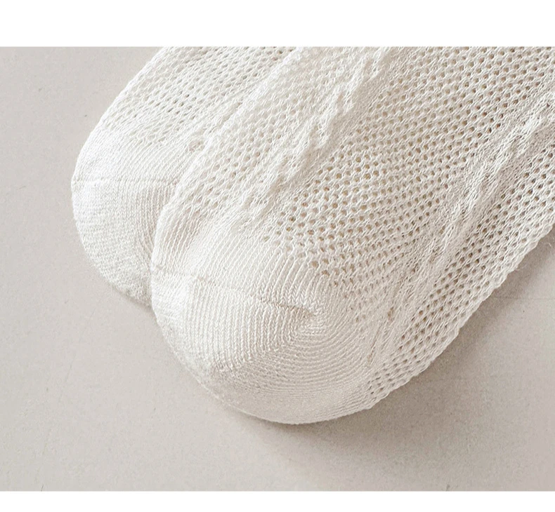 1 par de calcetines hasta la pantorrilla de encaje Floral dulce para niños niña Color Beige arco corazón hueco calcetín para niños Primavera Verano calcetín fino transpirable