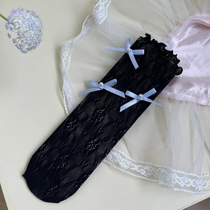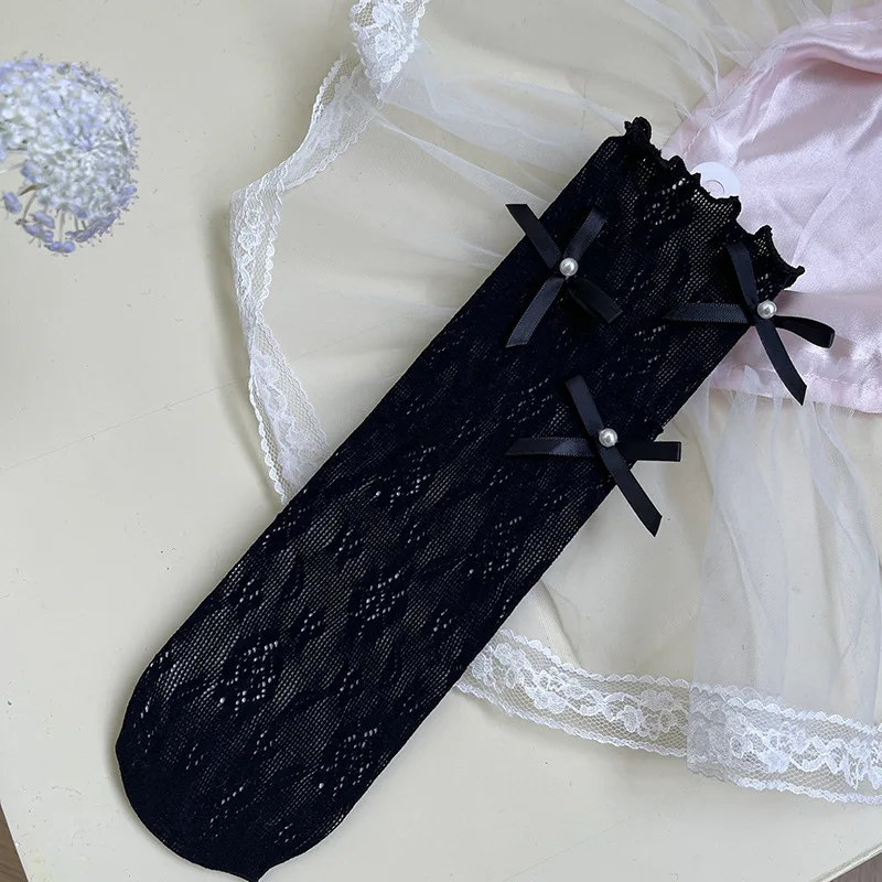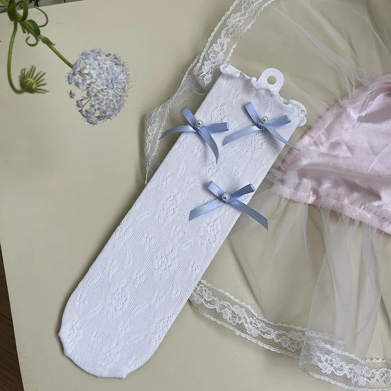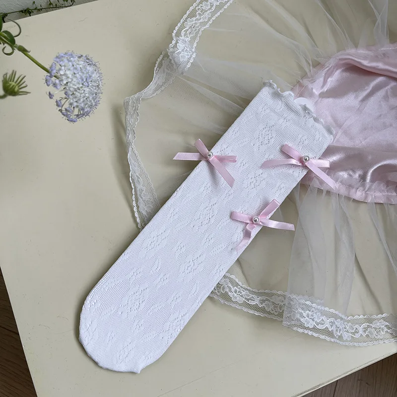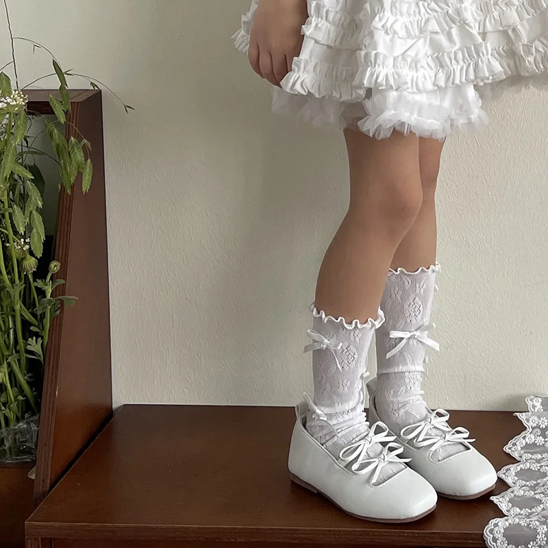 1 par de calcetines de pantorrilla florales de Jacquard de verano para niños y niñas, calcetines coreanos de moda con lazo para niños, calcetines dulces elásticos de nailon suave, ropa