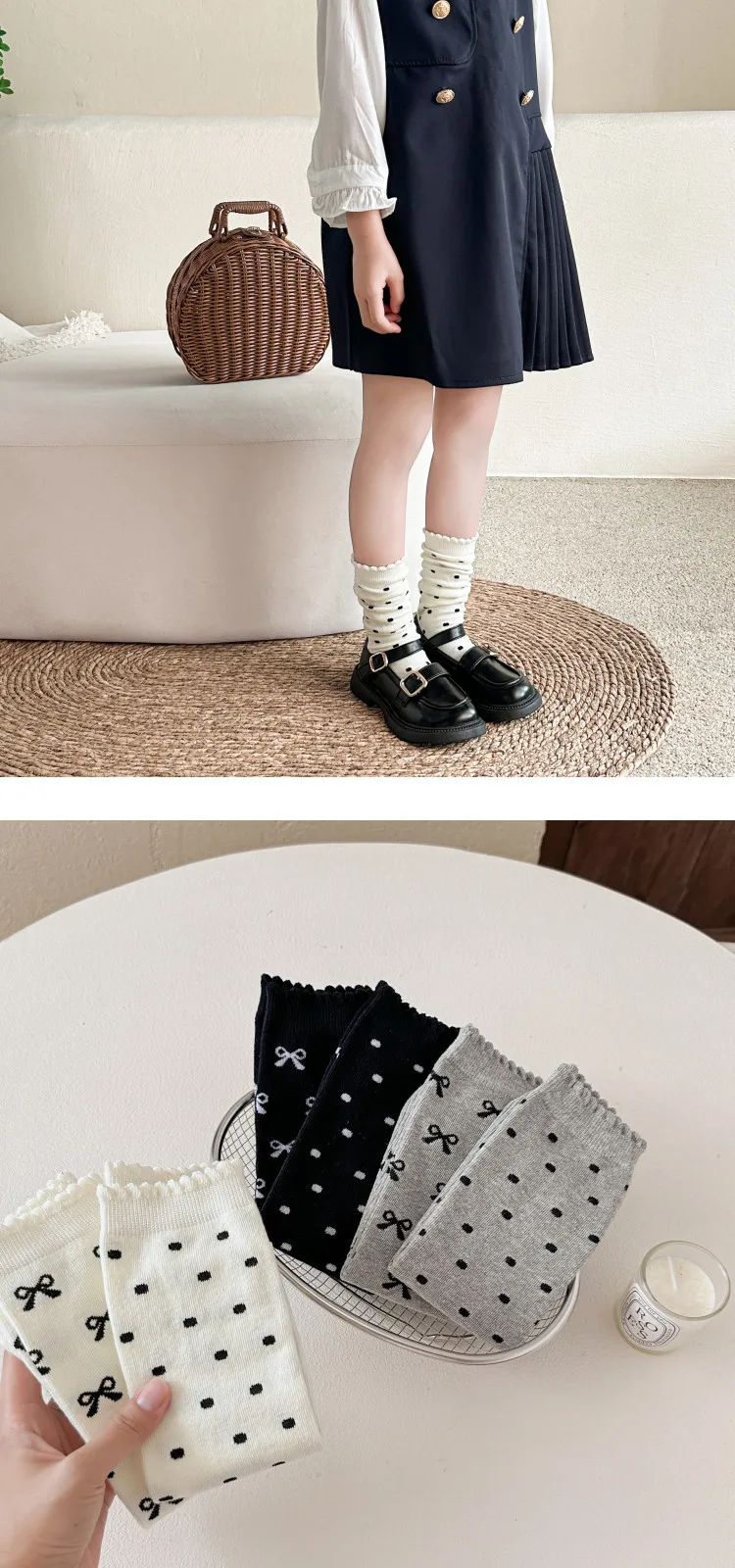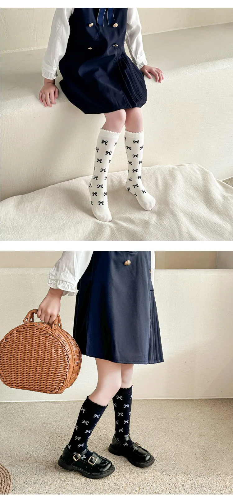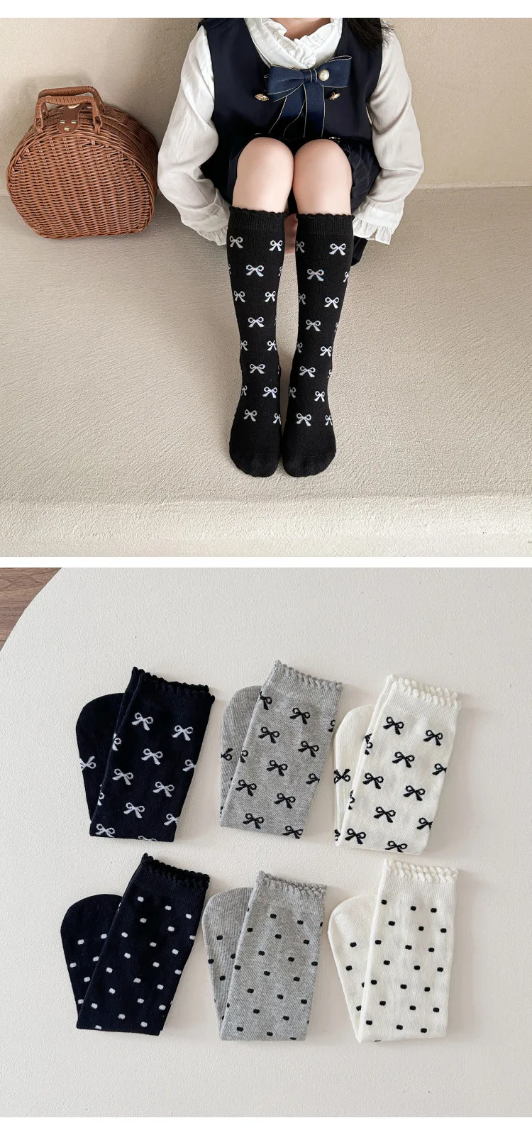 Comprar 1 par de calcetines sencillos de pantorrilla con lazo coreano para chico y niña, calcetines hasta la pantorrilla con estampado de puntos y lazo dulce para niños, calcetines escolares de algodón suave para primavera y verano
