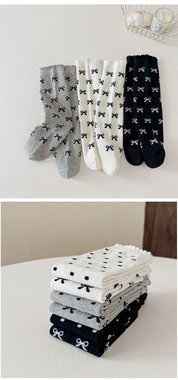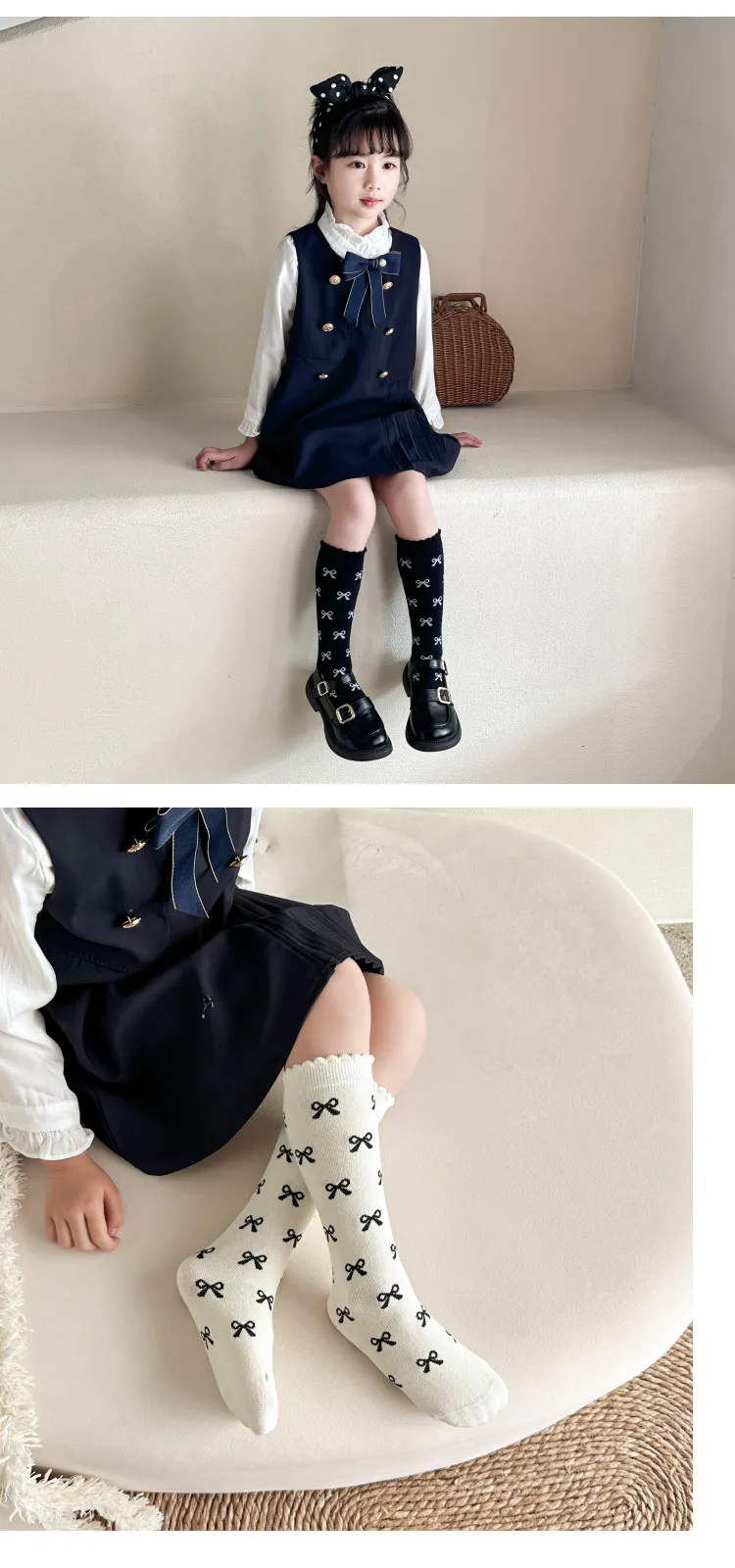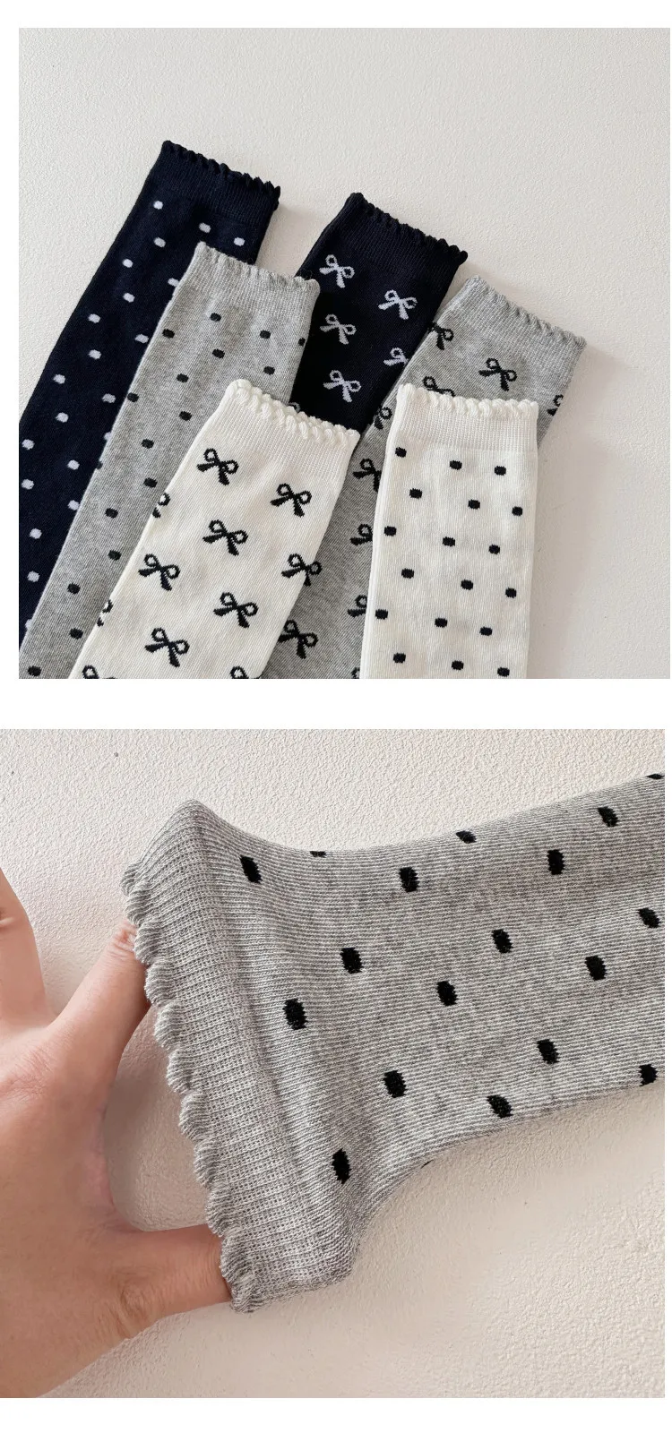 Comprar 1 par de calcetines sencillos de pantorrilla con lazo coreano para chico y niña, calcetines hasta la pantorrilla con estampado de puntos y lazo dulce para niños, calcetines escolares de algodón suave para primavera y verano