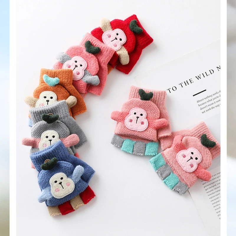 Comprar 1 par de guantes de invierno para bebés y niños, guantes de medio dedo de dibujos animados, manoplas de punto cálidas elásticas para niños y niñas de 1 a 5 años al aire libre