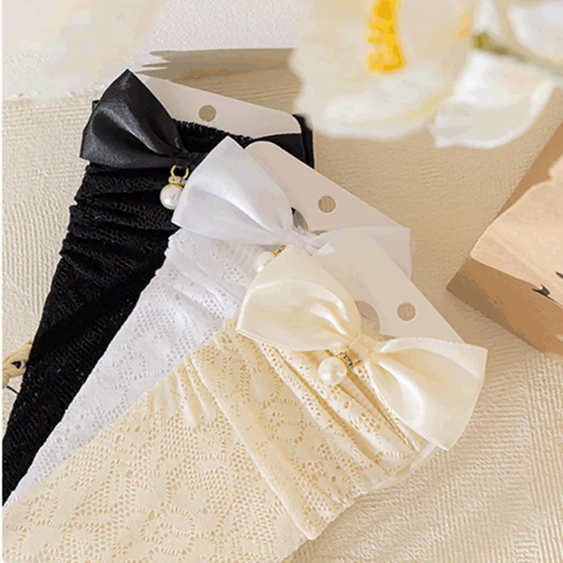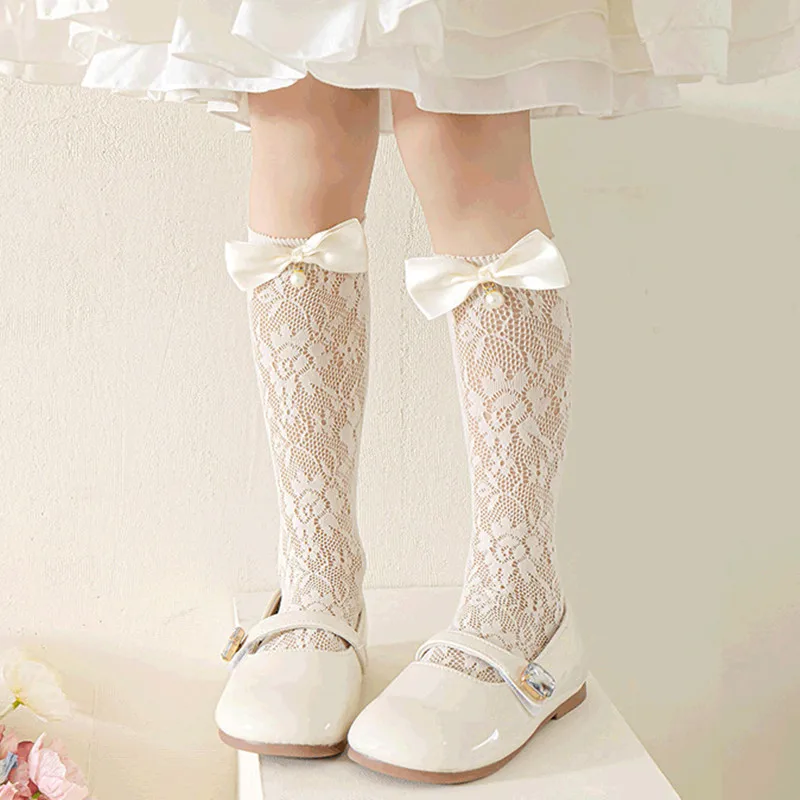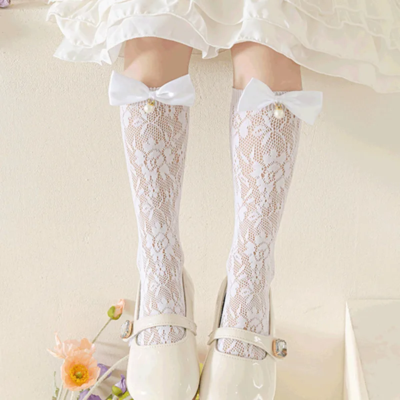 1 par de medias bonitas de encaje de malla con lazo para niñas, calcetines finos hasta la rodilla de verano para niñas Lolita