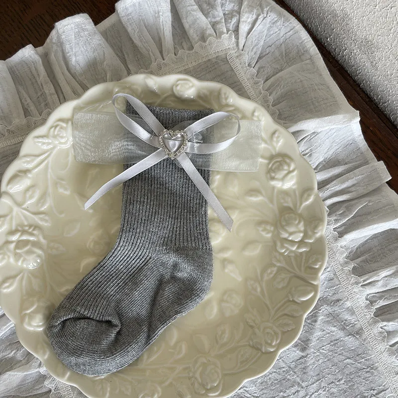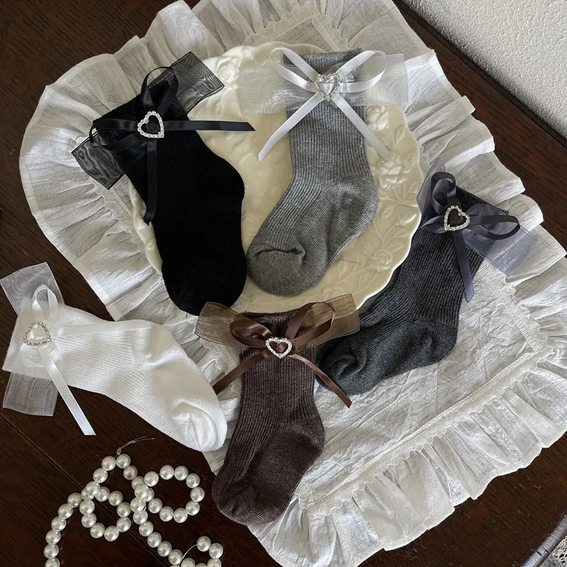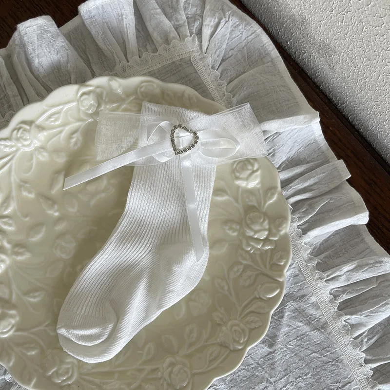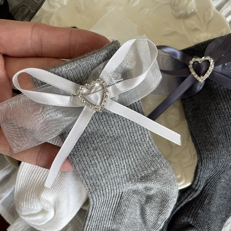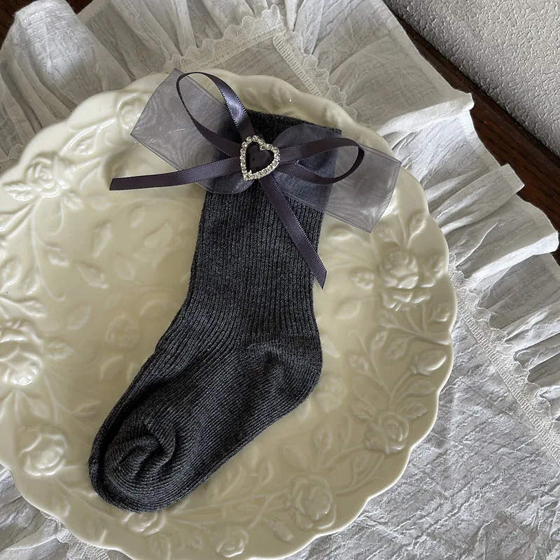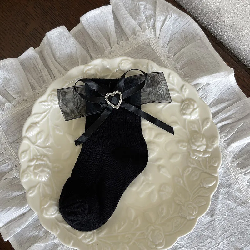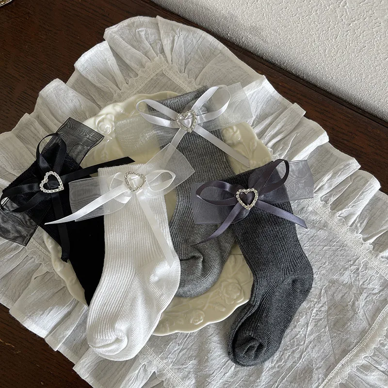 Comprar 1 par de nuevos calcetines hasta la pantorrilla con forma de corazón de cristal para niñas, calcetines con adorno de malla y lazo de tul, calcetines dulces de princesa para primavera y otoño para niños de 3 a 12 años