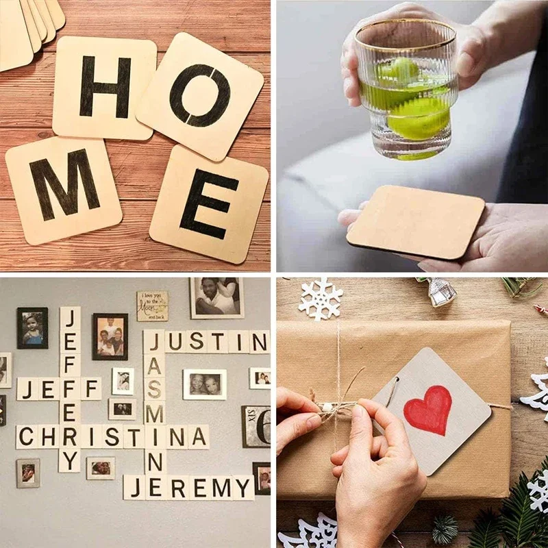 Rebanada de madera cuadrada en blanco con esquina redonda para manualidades, decoración del hogar, juegos de mesaCaracterísticas