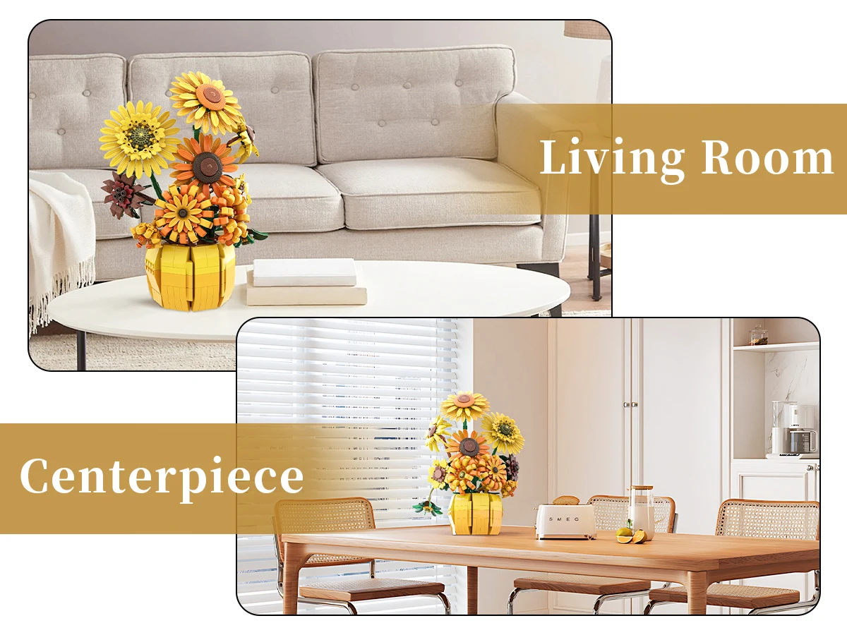 ✨Ideal para coleccionistas: este ramo de flores con bloques de construcción de girasol es una excelente adición a la exhibición de cualquier coleccionista.Los ladrillos de alta calidad y la atención al detalle lo convierten en un artículo imprescindible para los entusiastas de los bloques de construcción y los modelos de flores.