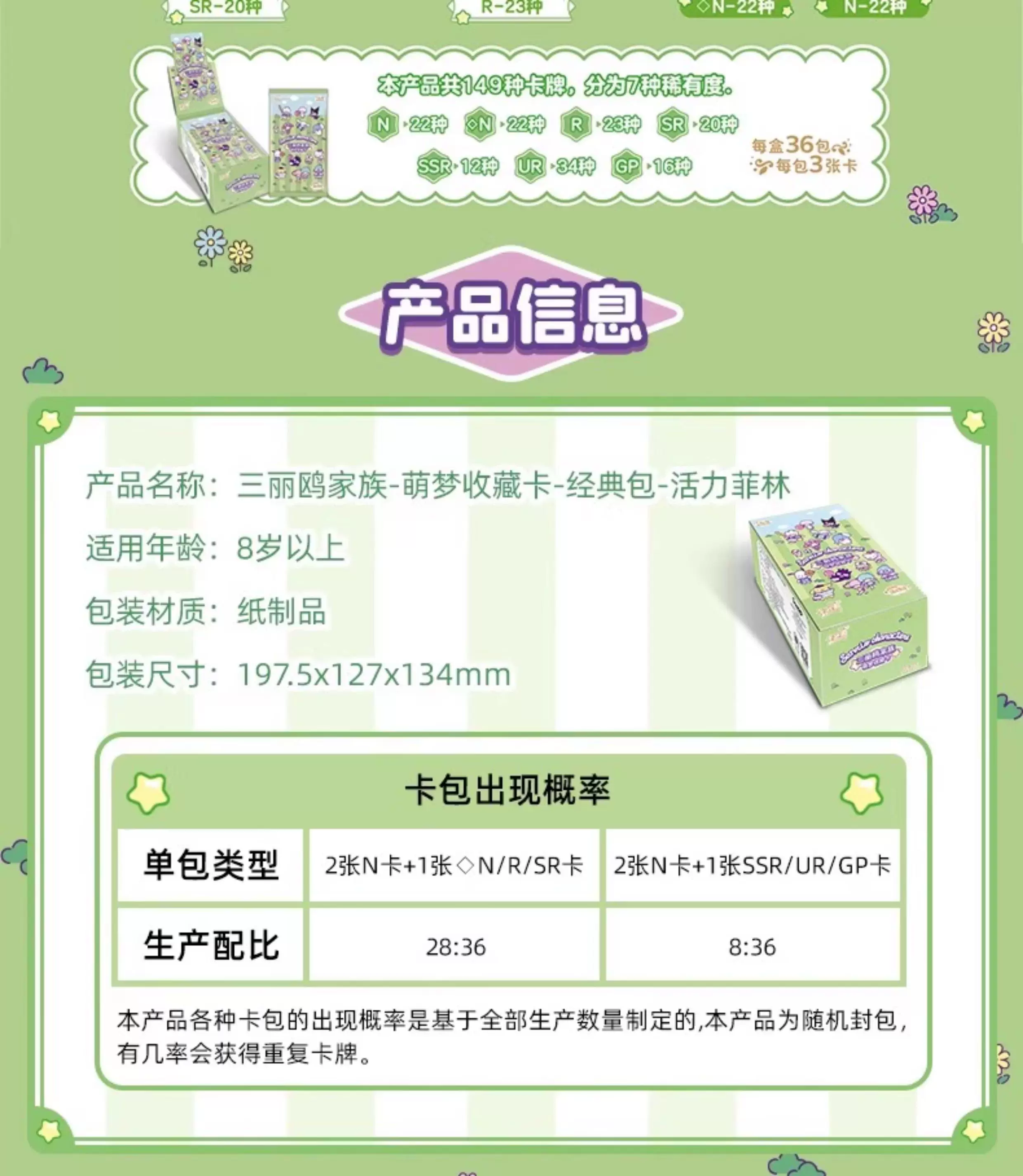 Cada paquete pequeño contiene 3 tarjetas y una caja contiene 36 paquetes pequeños. Una caja equivale a 36*3=108 tarjetas (con versiones duplicadas)