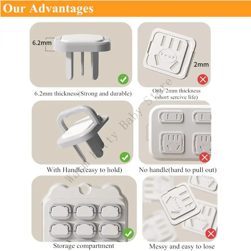 Características: Estos protectores de enchufes eléctricos cuentan con una construcción y compatibilidad de ABS resistente a roturas, se ajustan perfectamente a tomas de dos y tres clavijas mientras mantienen una estética discreta a juego de paredes.