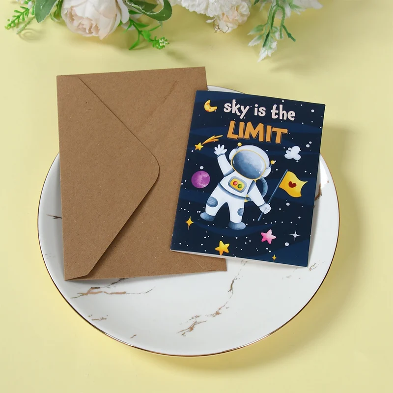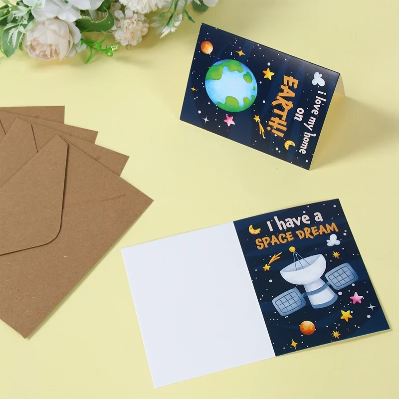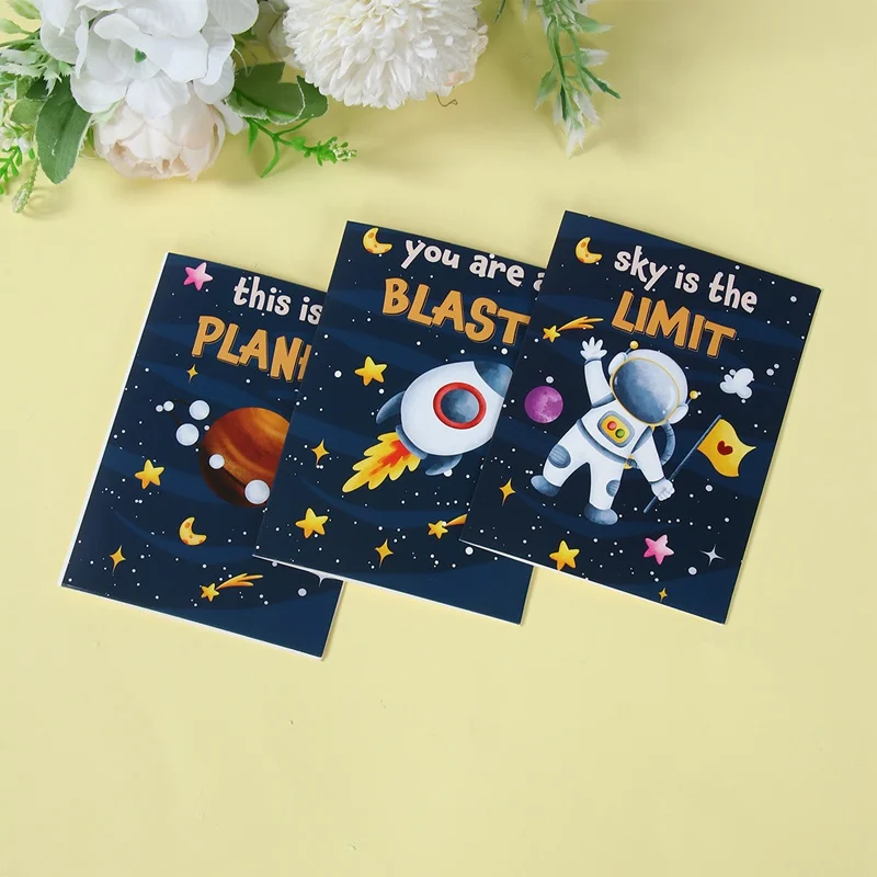 12 unids/set cohete astronauta planeta tarjeta de felicitación decoración de fiesta de cumpleaños para niños favores postal tarjeta de felicitación suministros de fiesta