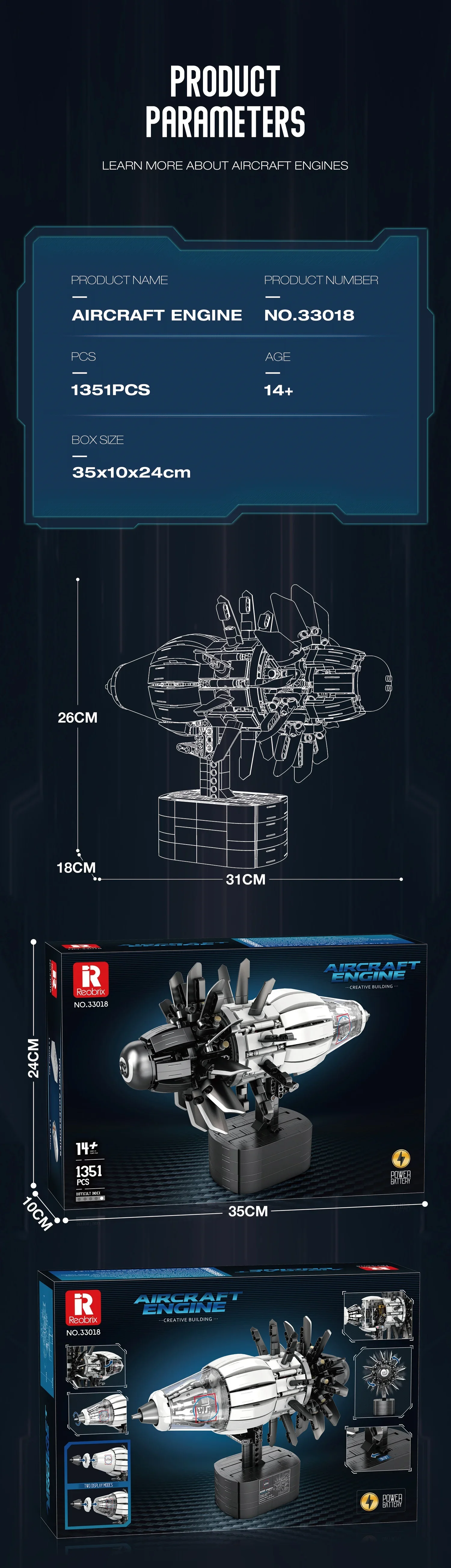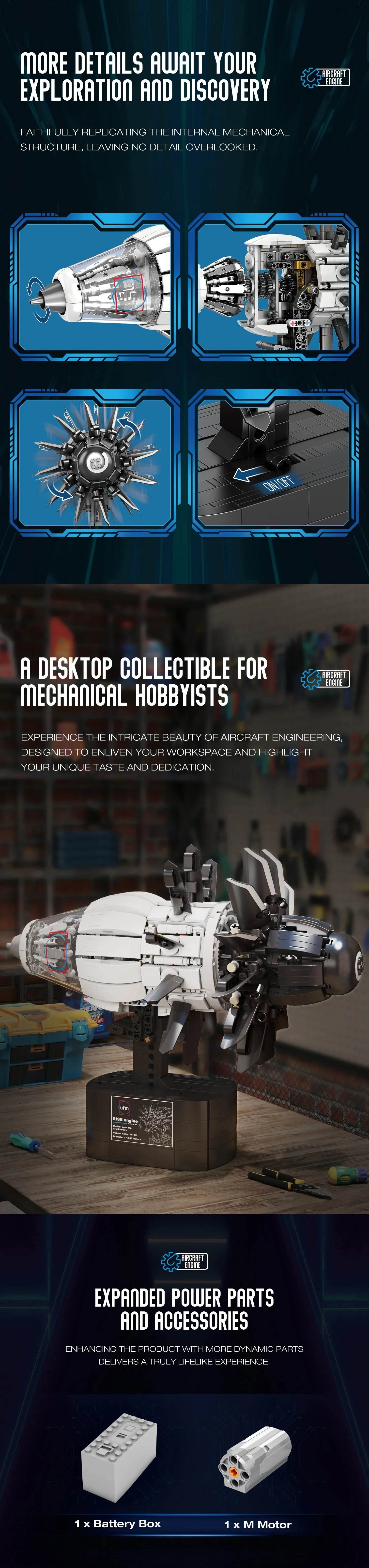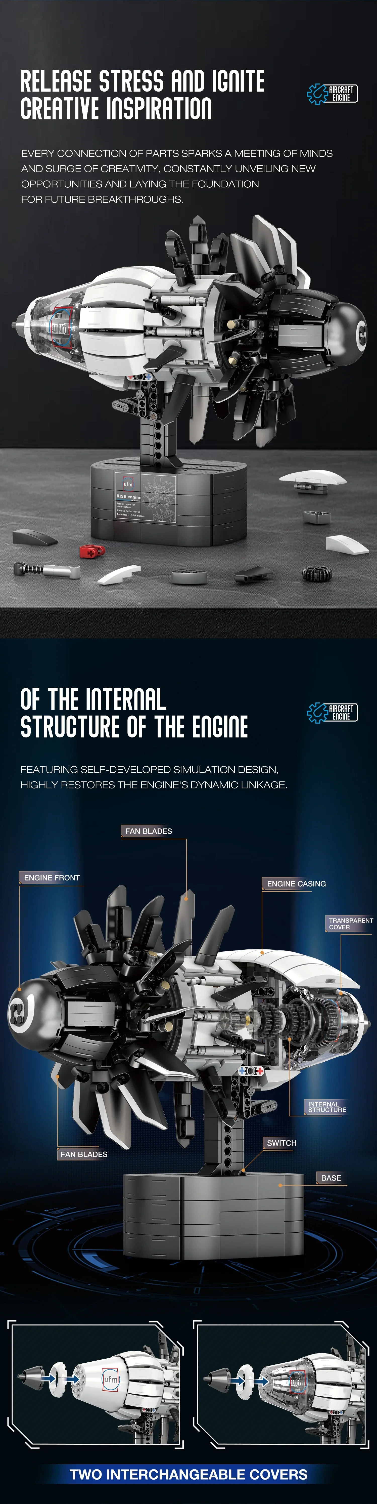 Construya un impresionante modelo de 1351 piezas que recrea con precisión un motor de avión turbofan real con detalles exteriores auténticos, incluidas aspas del ventilador de admisión, cámara de combustión y boquilla de escape: ¡un artículo imprescindible para los entusiastas de la aviación!
