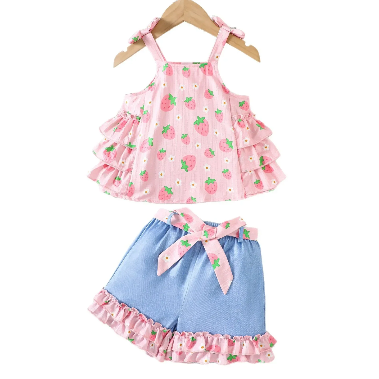 2 piezas 2025 ropa de verano para niñas pequeñas moda coreana dibujos animados lindo estampado sin mangas algodón bebé Tops + Pantalones cortos conjuntos para niños B063