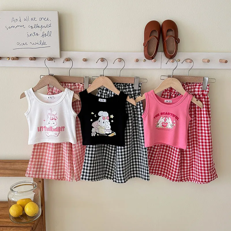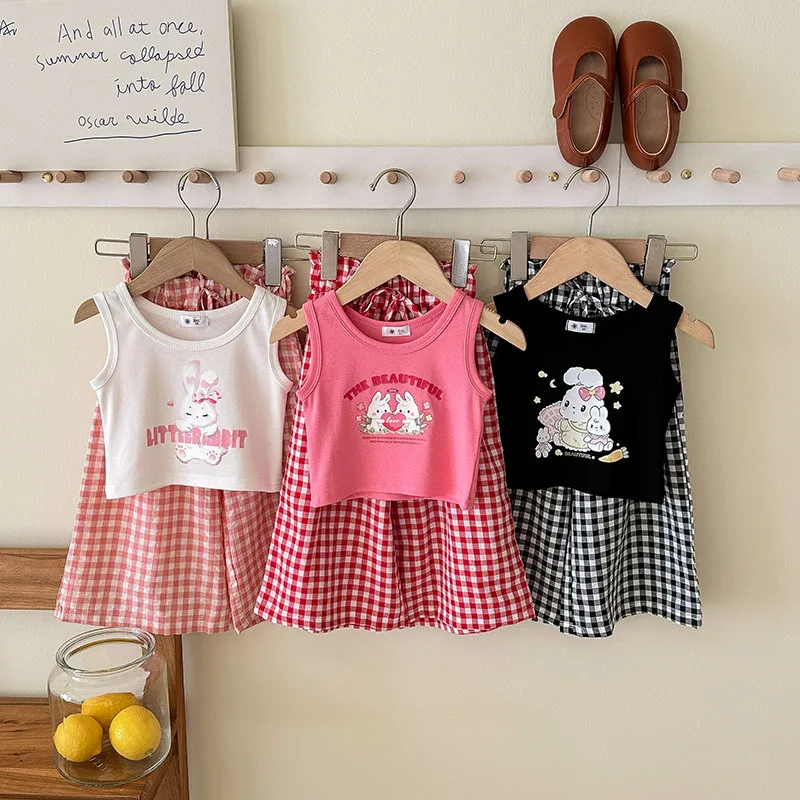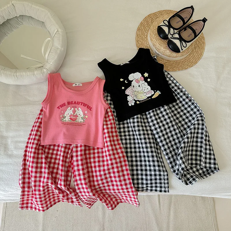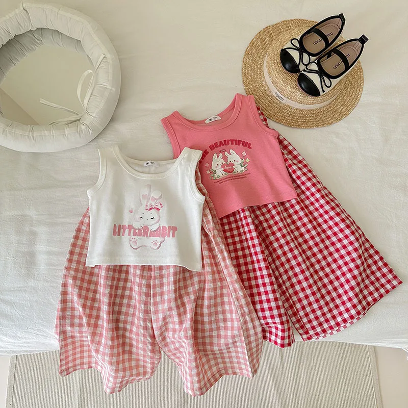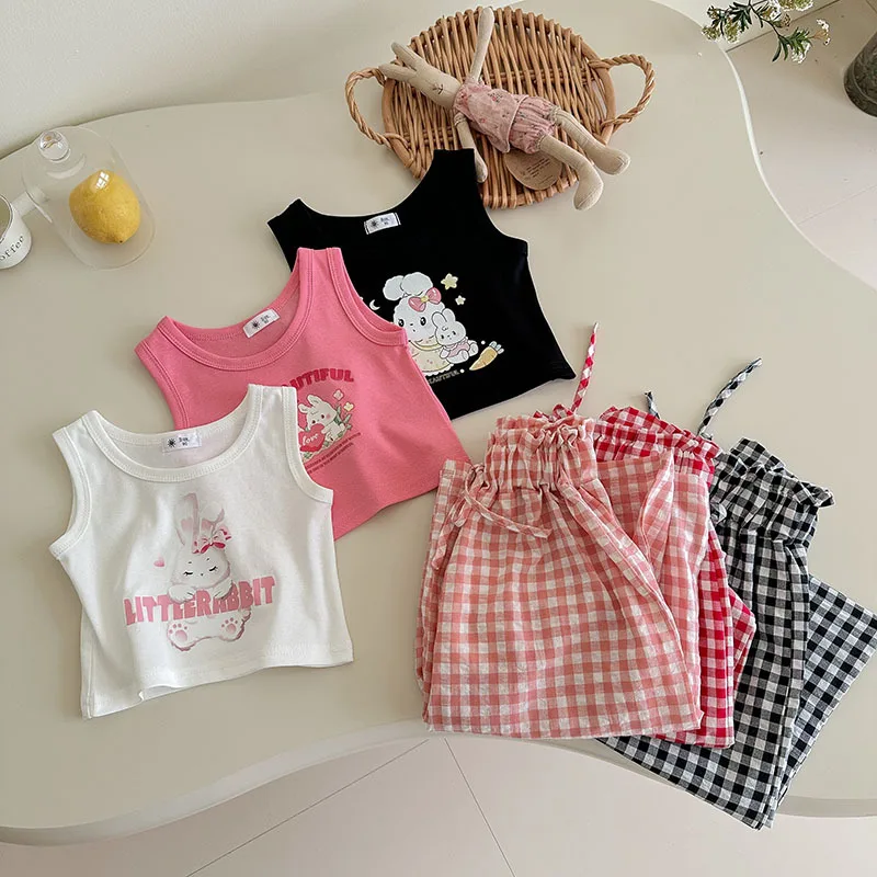 2 uds. Chaleco con estampado de animales para niñas lindas de verano + pantalones a cuadros para niños pantalones de pierna ancha cintura de flores
