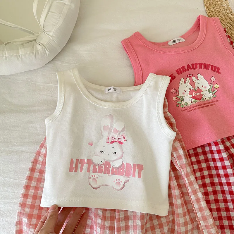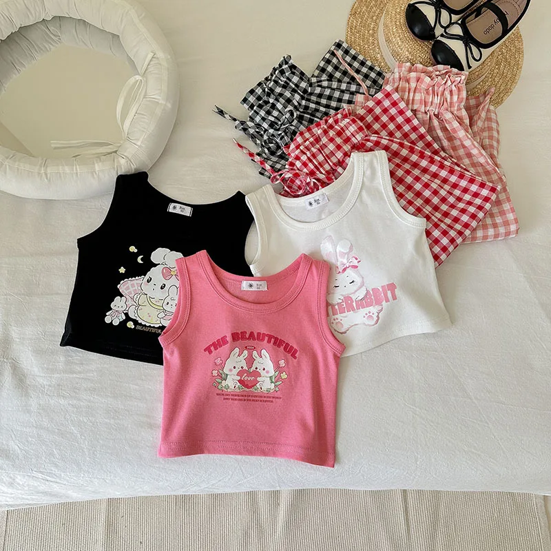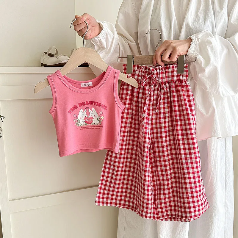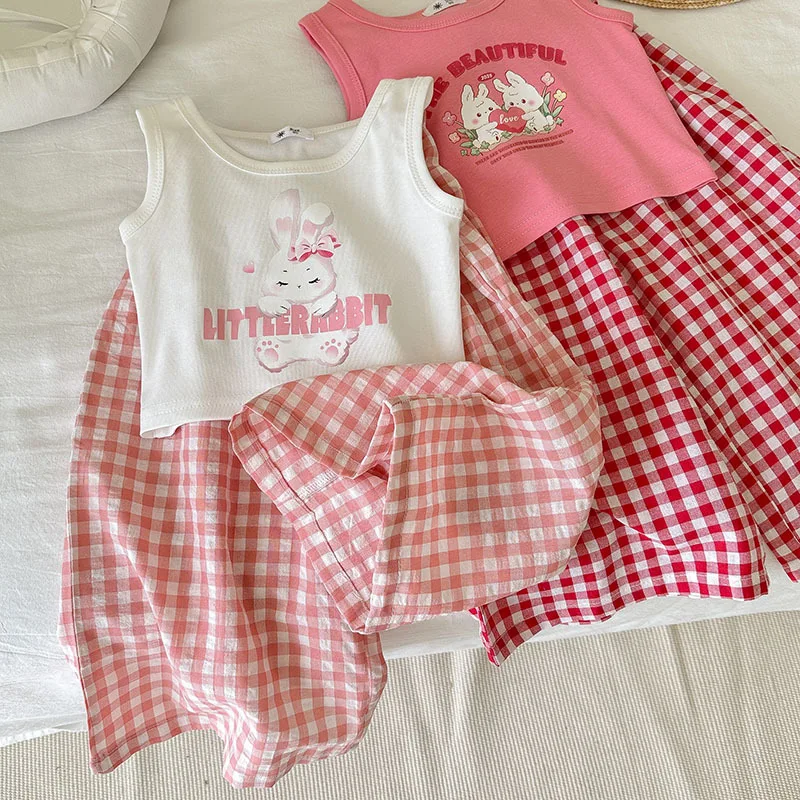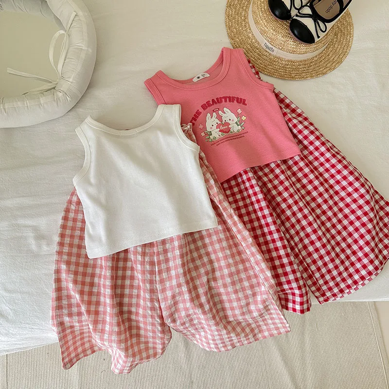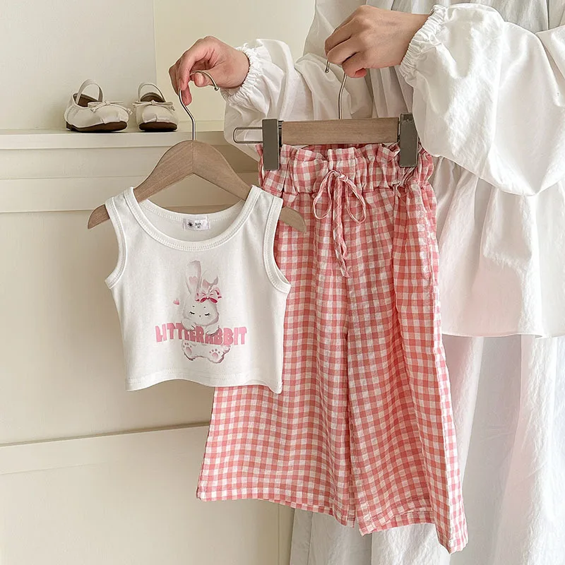 2 uds. Chaleco con estampado de animales para niñas lindas de verano + pantalones a cuadros para niños pantalones de pierna ancha cintura de flores - imagen 1