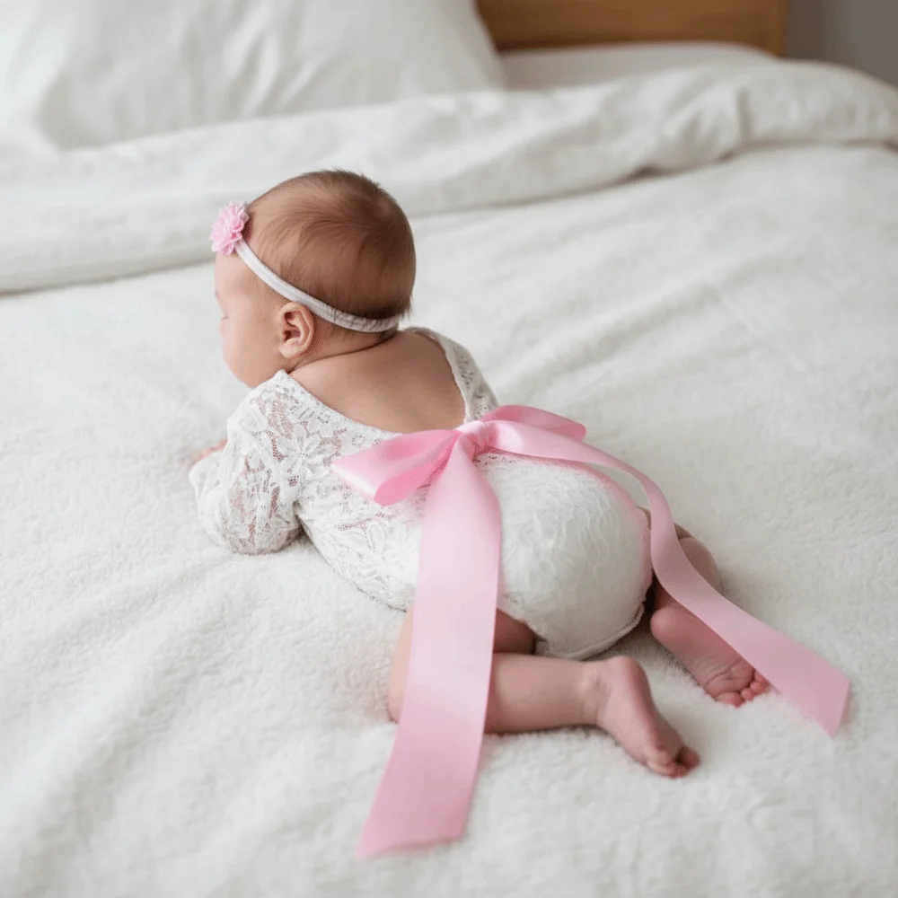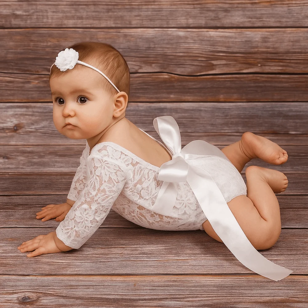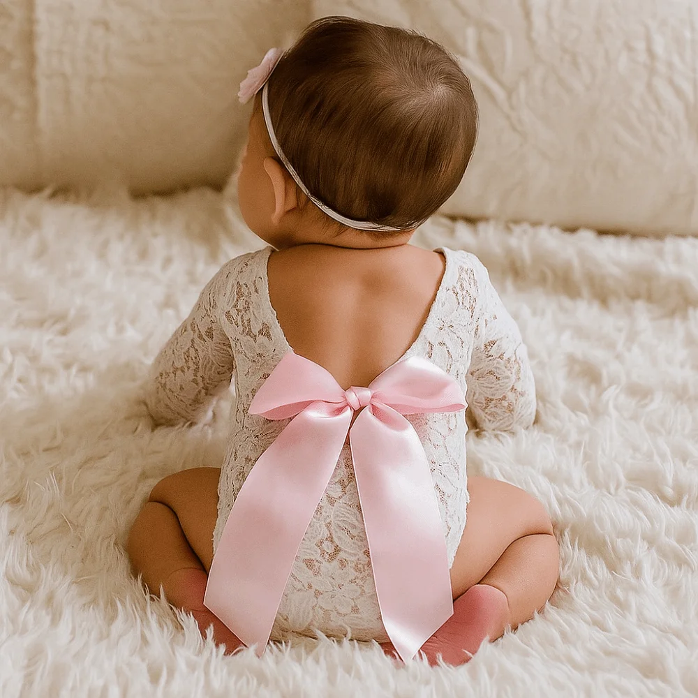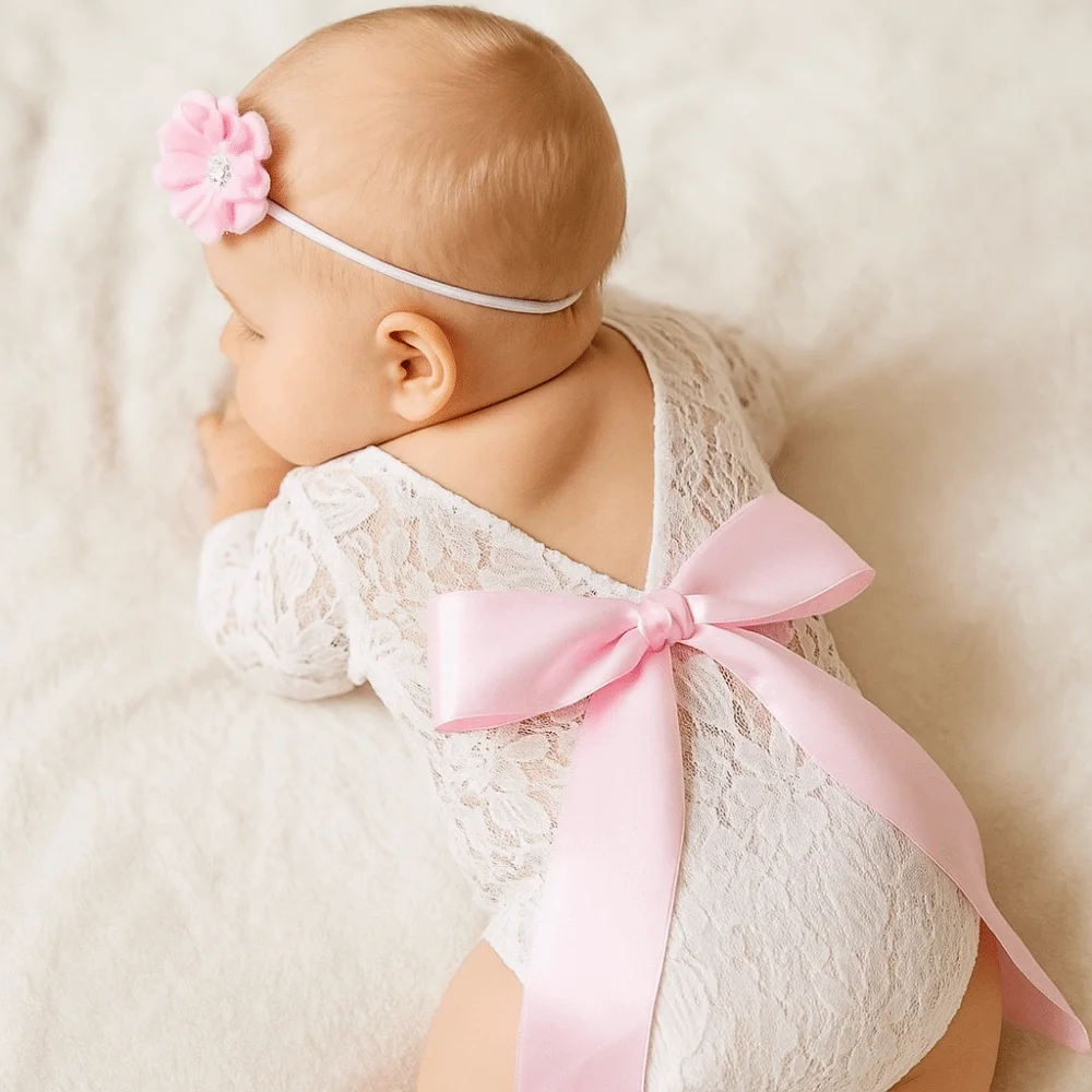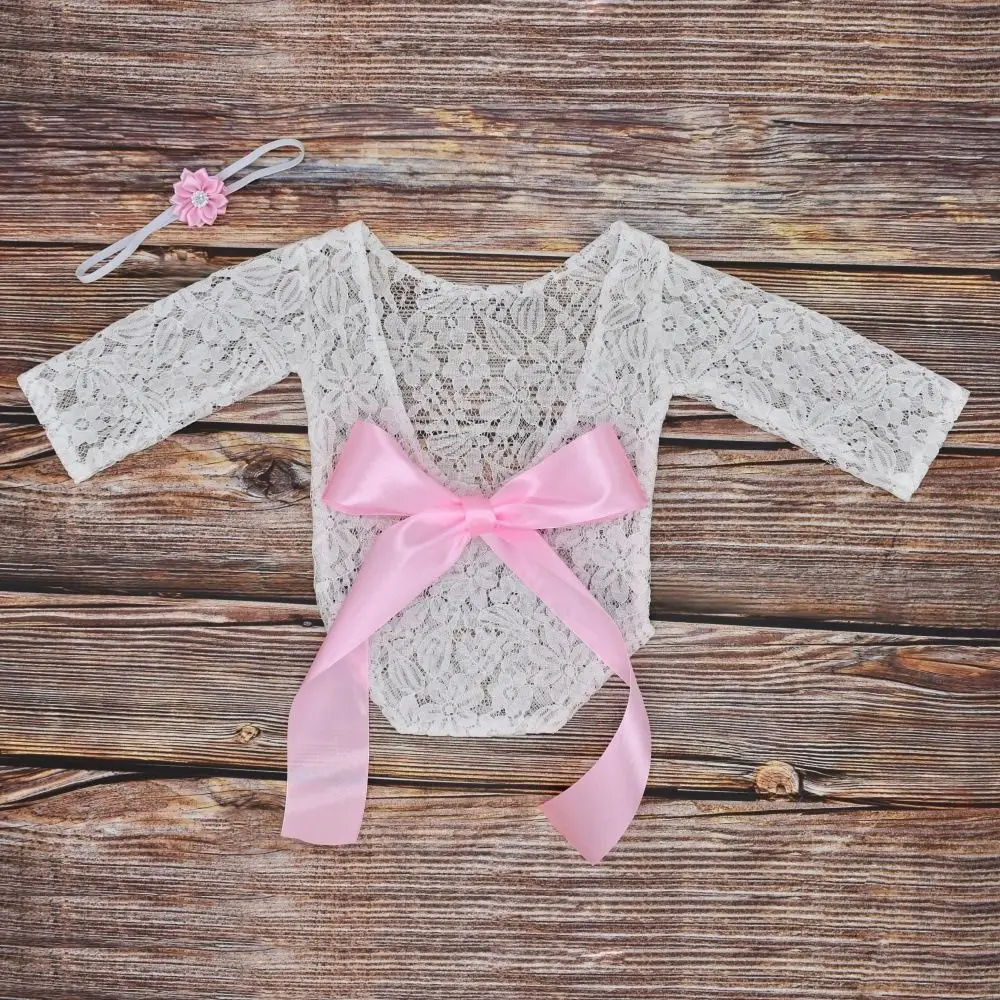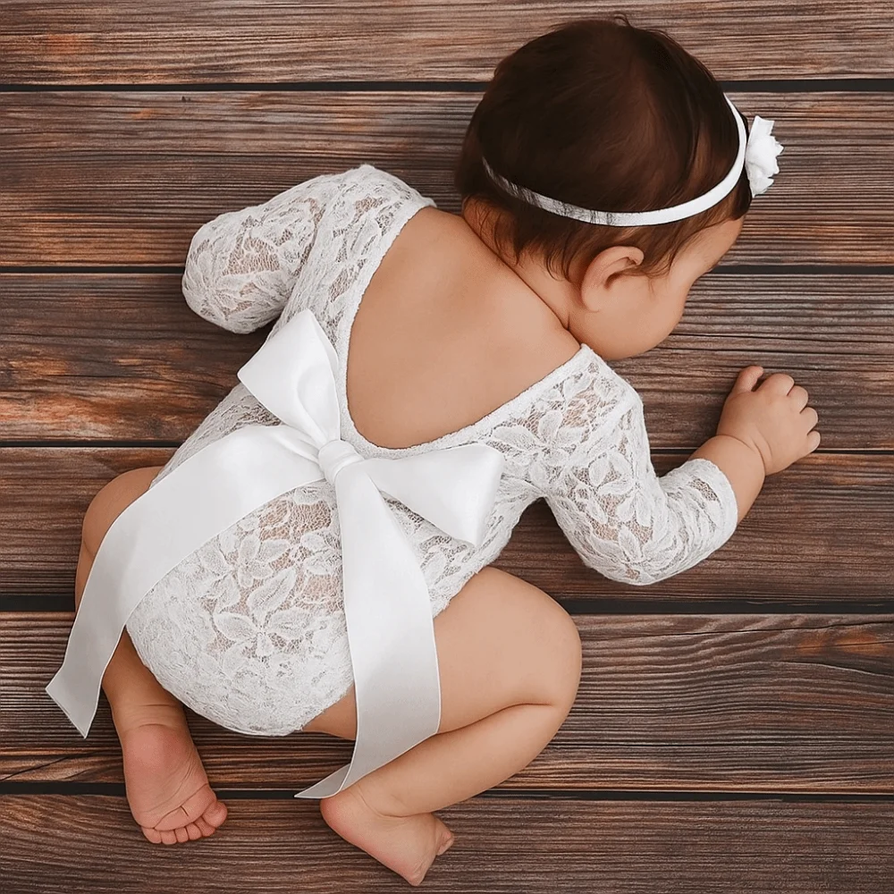 Este listado es para un delicado y delicado mameluco de encaje para recién nacido con un diseño de espalda abierta con un lazo de seda.