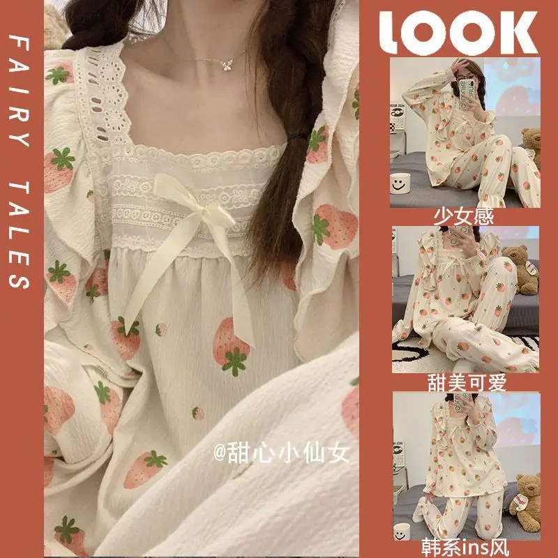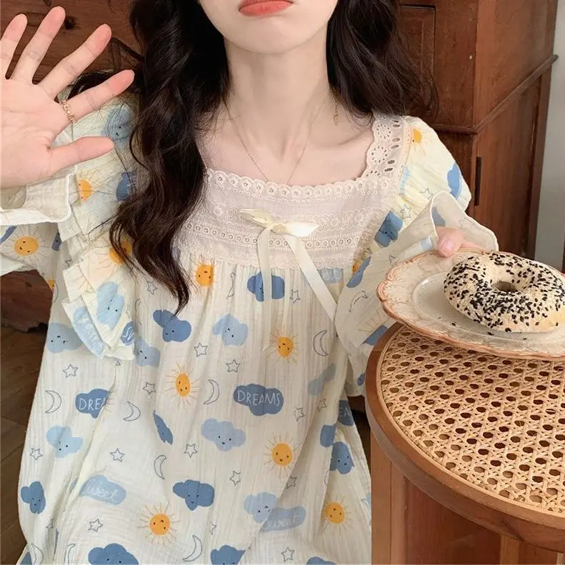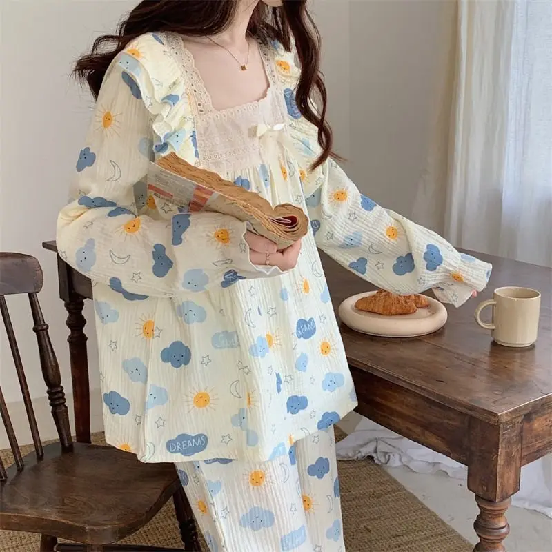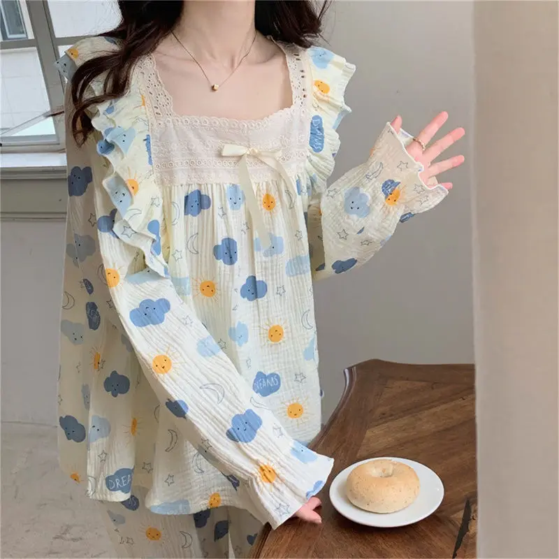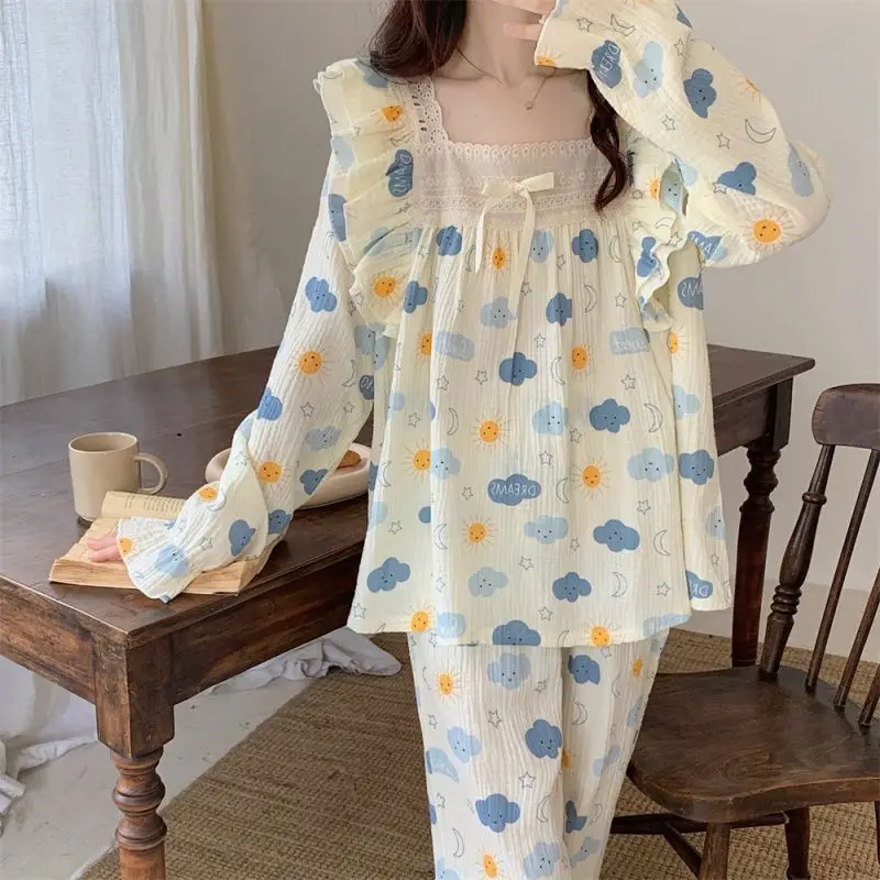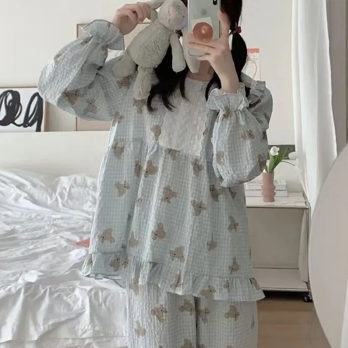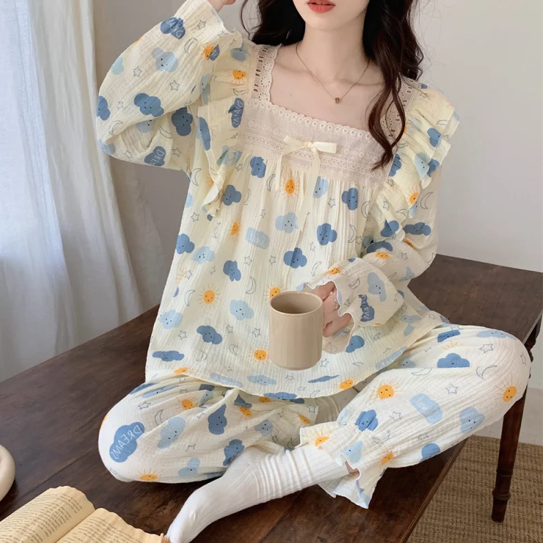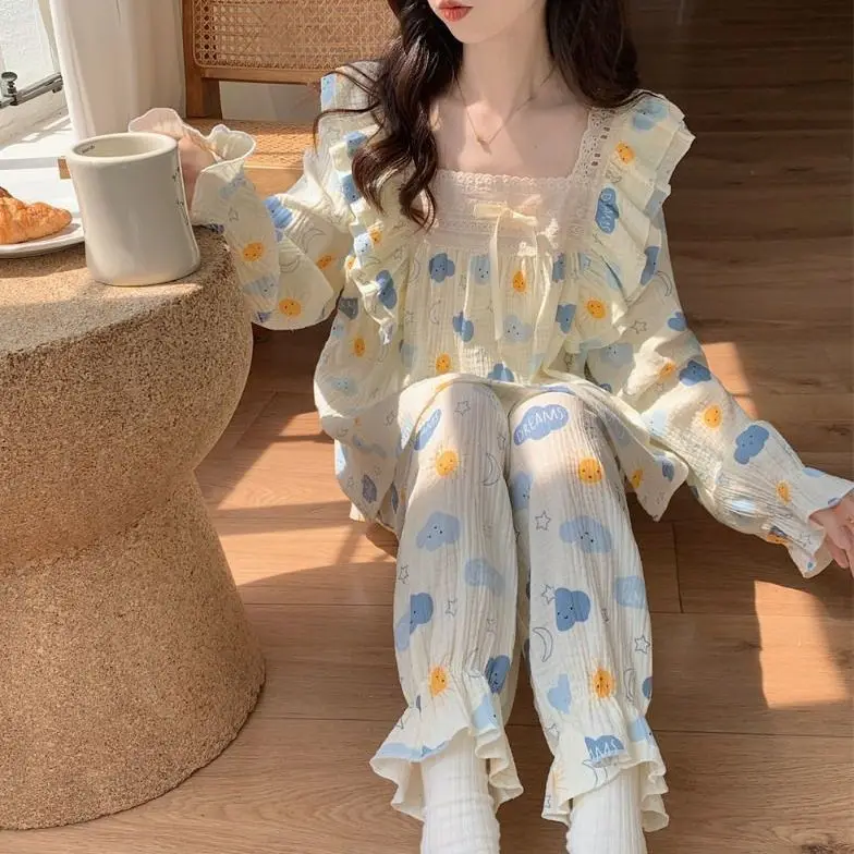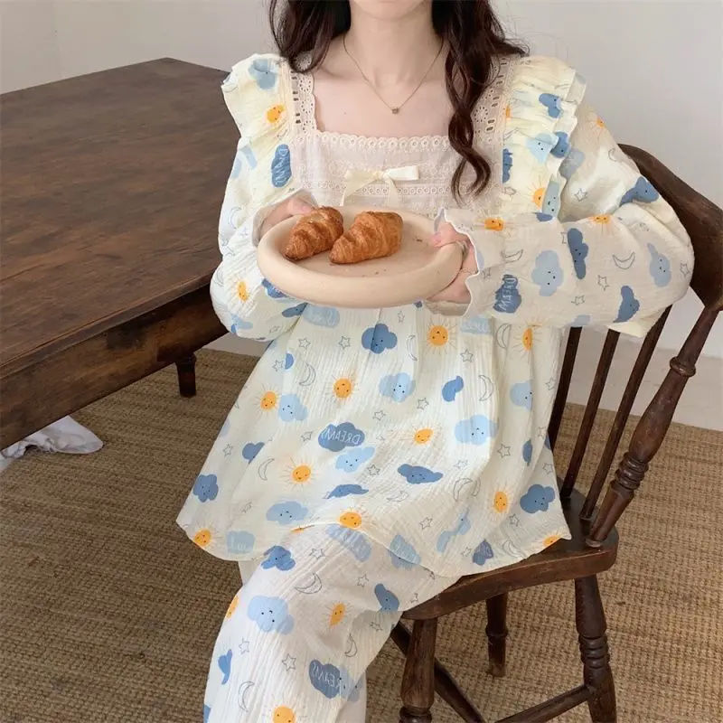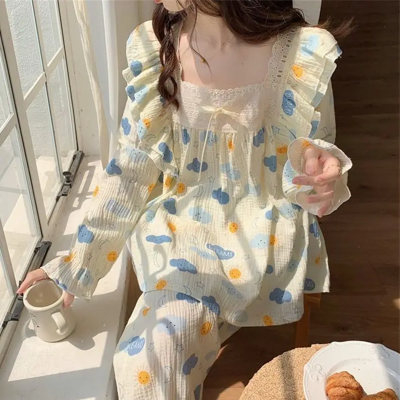 Comprar 2 unids/set primavera otoño puro algodón posparto lactancia encaje estampado maternidad ropa de lactancia mujeres embarazadas pijamas traje