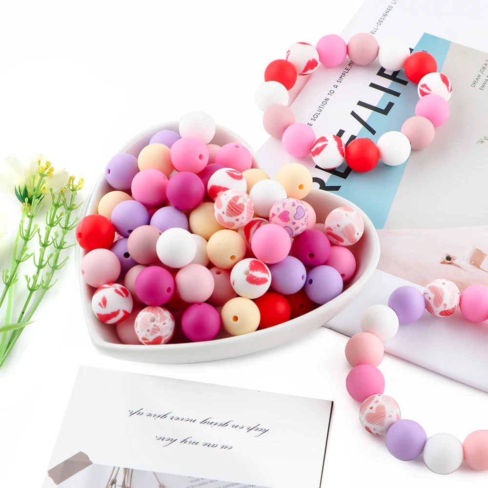 20-50 Uds. Cuentas de silicona estilo del Día de San Valentín de 15MM mezcla de cuentas estampadas para fabricación de joyería DIY llavero pulsera collar accesorios