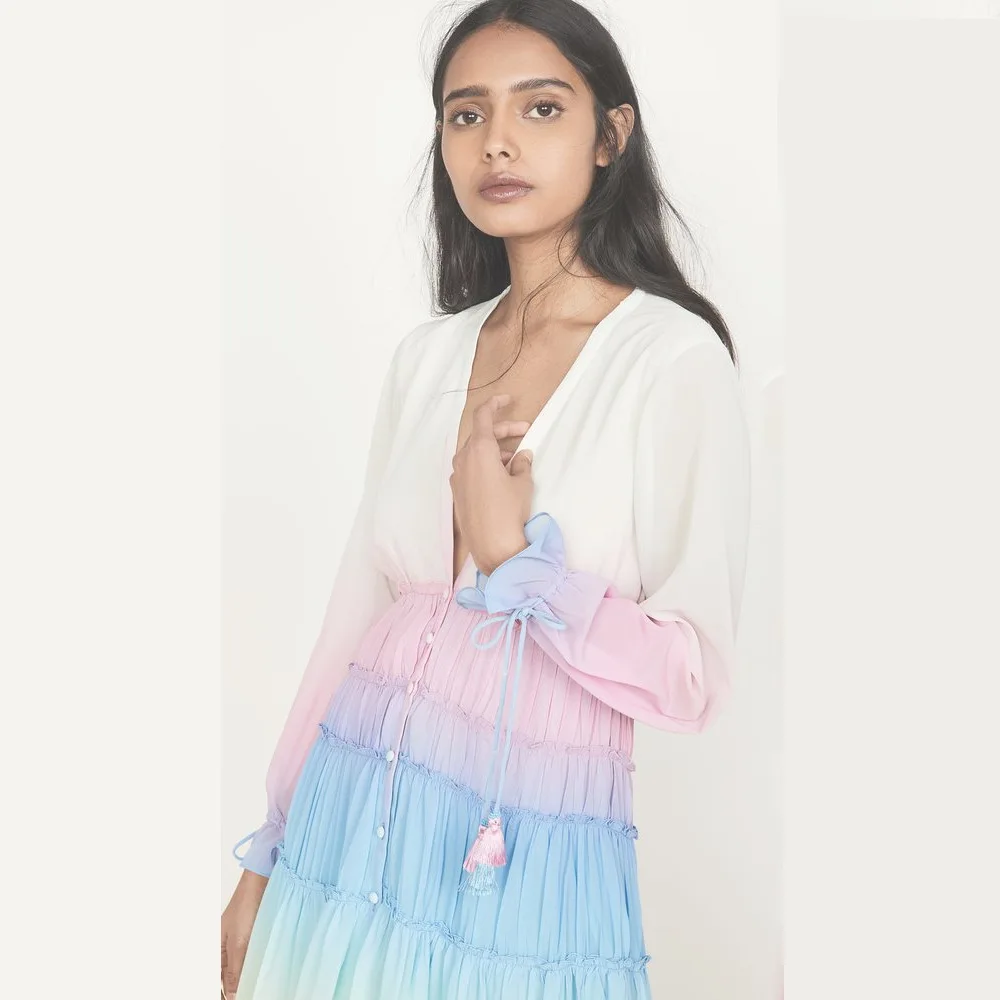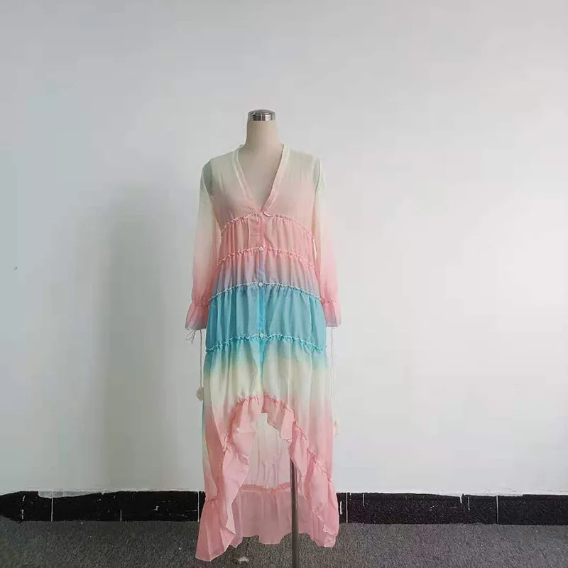2022 primavera novedad de verano vestido de maternidad degradado con cuello en V de manga larga vestido de costura de gasa mujer vestido de fregado de encaje de hoja de loto